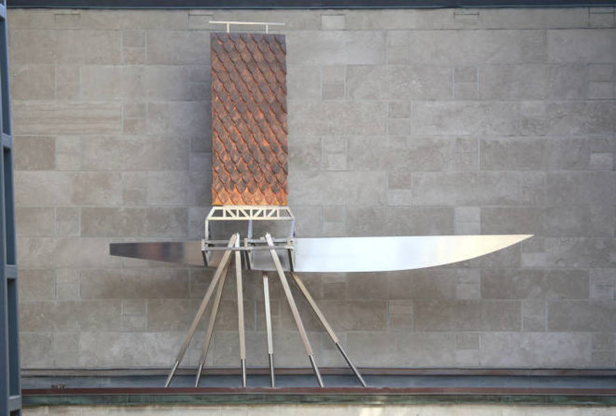 La sculpture représente un voilier dont la coque et la voile reprennent les formes que l'on retrouve dans l'architecture du pavillon Palasis-Prince. La voile rappelle les capteurs solaires des satellites en orbite autour de la Terre, ou encore les panneaux-réclames qui véhiculent du monde une image médiatique séduisante mais pas toujours innocente, comme les sirènes rencontrées par Ulysse au cours de son long périple. Les pattes du voilier rappellent, quant à elles, les pilotis, les pattes articulées des engins robotisés, ou encore les pattes d'un chevalet soutenant un tableau.