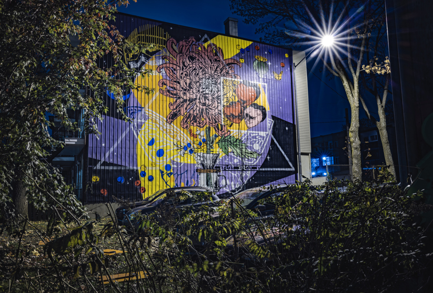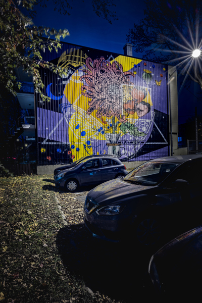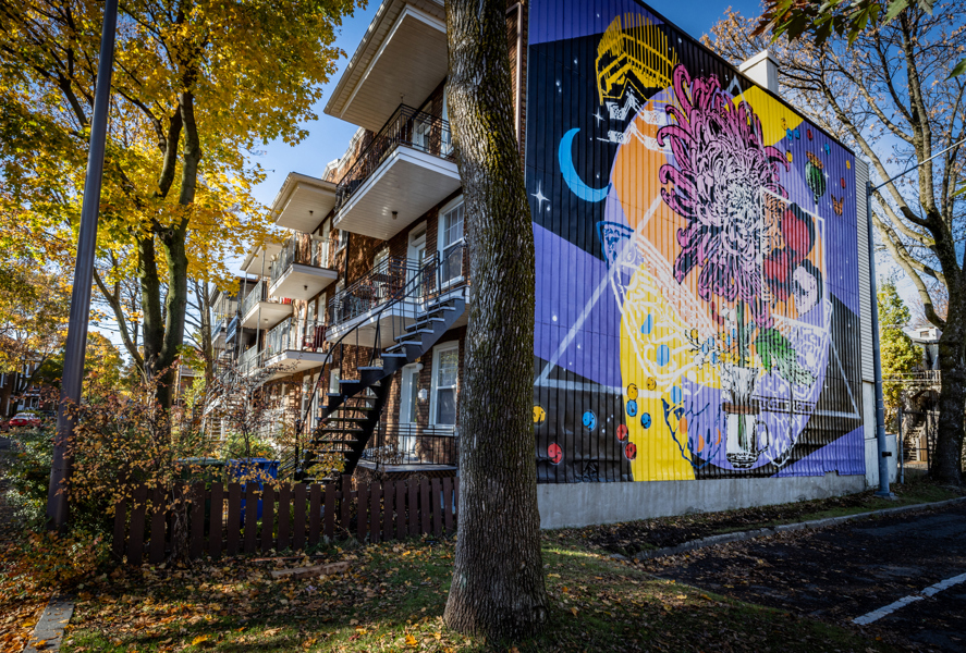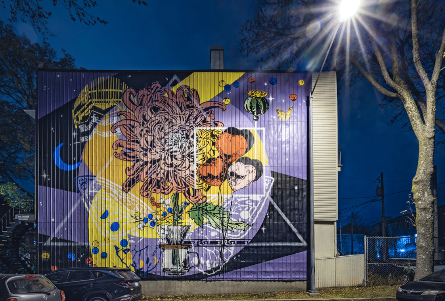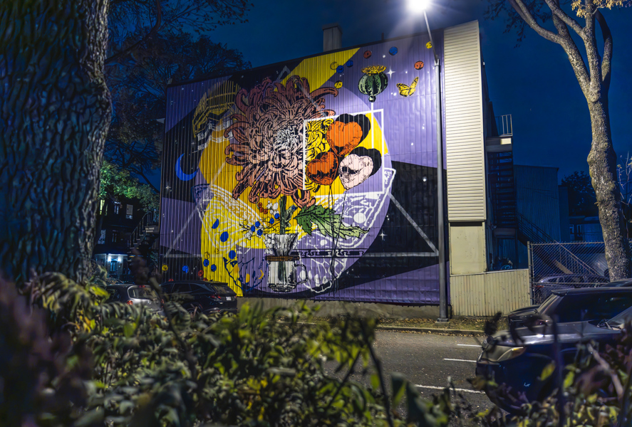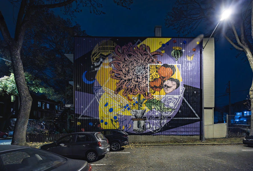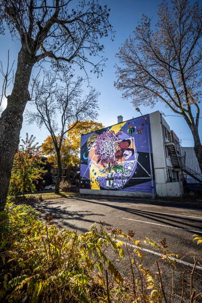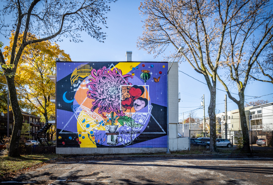 L’œuvre évoque une fête qui célèbre l’enfance et le temps qui passe. Longeant une ruelle, la murale crée un lieu de passage inspirant la réjouissance collective. Elle invite le passant à vivre comme des enfants, à être dans l’instant présent.