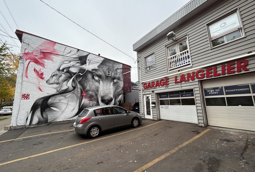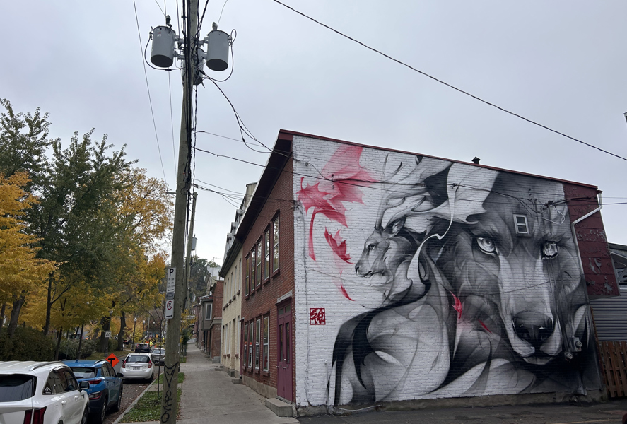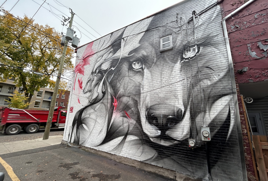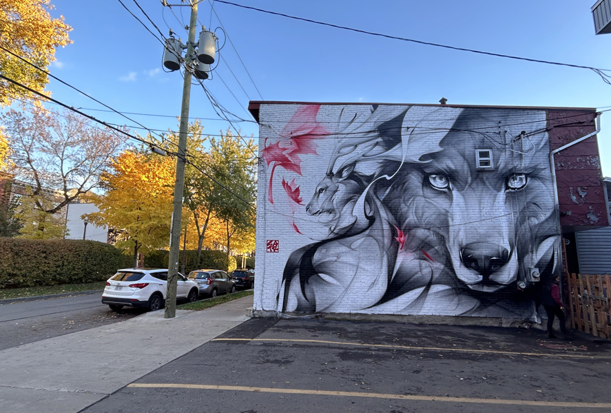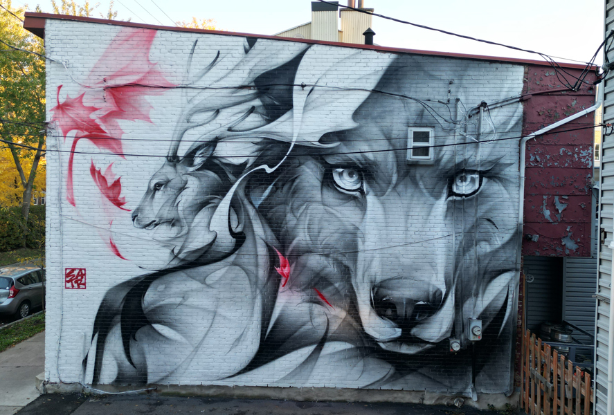 L’œuvre a été réalisée par la muraliste chinoise SATR, lors de sa visite au Canada à l’automne 2023. Reconnue pour ses représentations d’animaux, elle reproduit avec la peinture en aérosol les effets de la peinture chinoise traditionnelle. Elle a choisi ici de représenter un loup et un cervidé, des animaux sauvages vivant sur notre territoire.