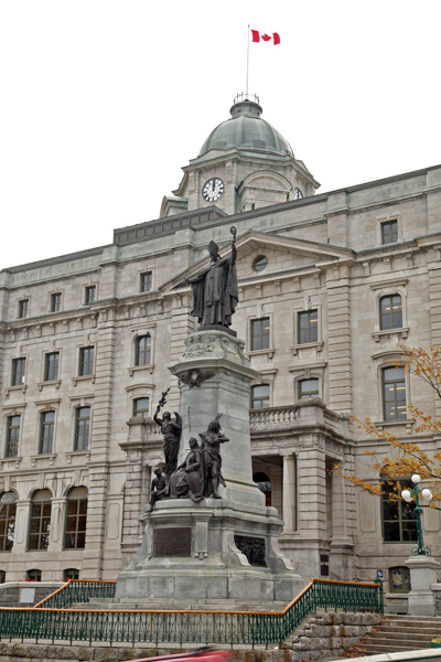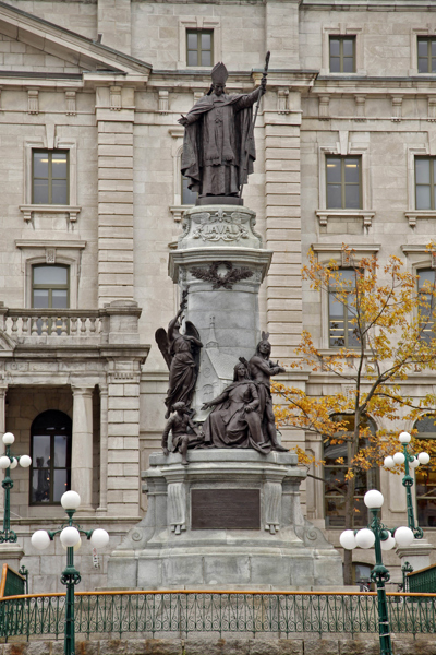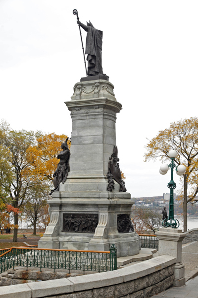 La statue de Mgr François de Montmorency-Laval, premier évêque de la Nouvelle-France et fondateur du Séminaire de Québec, domine le paysage. Coiffé de la mitre et revêtu de la chape épiscopale, le prélat ouvre les bras dans une attitude d’accueil. Contre le fût s’appuie une allégorie de la Religion entourée d’un Amérindien, d’un collégien et d’un ange personnifiant la Gloire.