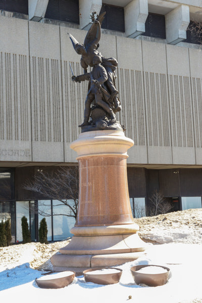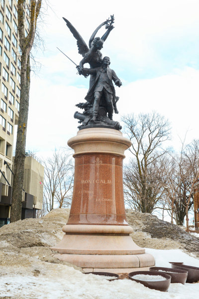 En 1759, Louis-Joseph de Saint-Véran, marquis de Montcalm, commande les troupes françaises lors de la bataille des plaines d’Abraham, où il trouvera la mort. Le sculpteur l’a représenté blessé sur le champ de bataille, l’épée encore à la main, un canon à ses pieds. Il est soutenu par une figure ailée, la Renommée, qui s’apprête à le couronner de laurier, gage de son héroïsme.