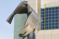 Une feuille recourbée en acier poli, qui rappelle aussi une flamme, enveloppe le sommet d’un imposant socle aux lignes épurées. La sculpture très architecturée allie différentes finitions pour mieux accrocher la lumière.