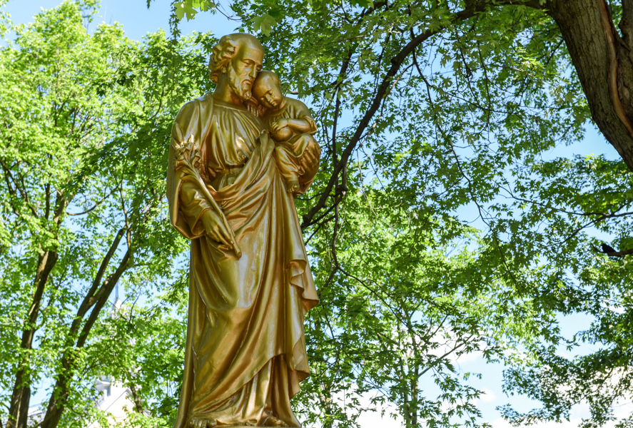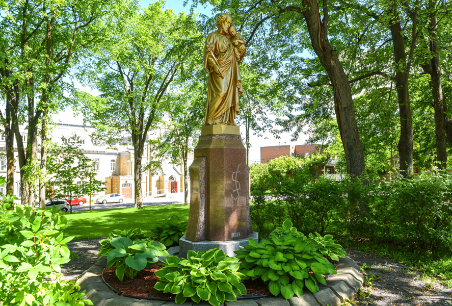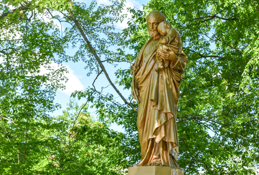 La statue de Saint-Joseph tenant l’enfant Jésus contre son épaule et un lys dans la main droite fait face à la maison mère et à l’oratoire des Sœurs de Saint-Joseph de Saint-Vallier.