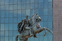 Général et homme d’État vénézuélien, Simón Bolívar a contribué à l’indépendance des colonies espagnoles d’Amérique du Sud à compter de 1813. Le « Libertador », comme on le surnommait, est aujourd’hui un personnage majeur de l’histoire universelle. Il est représenté vêtu de l’habit militaire, monté sur un cheval superbement harnaché.