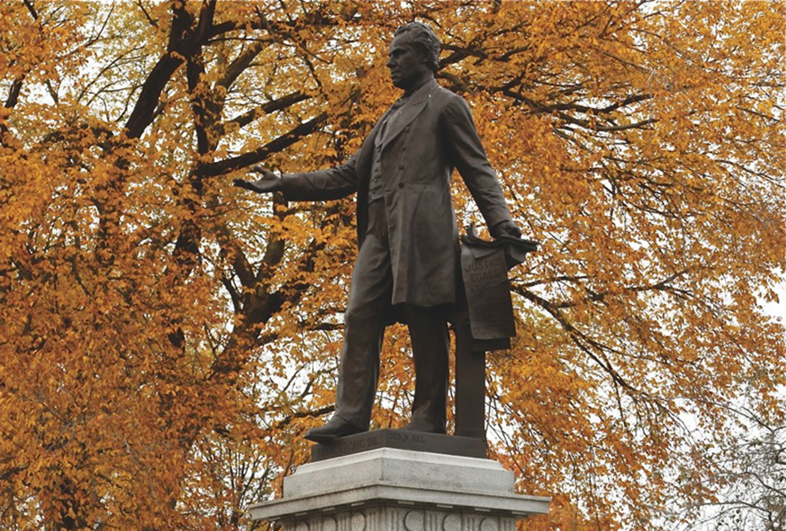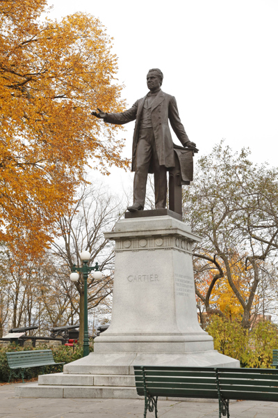La statue est une réplique de celle qui a été érigée en 1919 dans le parc du Mont-Royal à Montréal et qui est considérée comme le chef-d'œuvre de Hill. Figure notoire de l’histoire canadienne, sir George-Étienne Cartier est immortalisé dans sa fonction de parlementaire. Sur le socle, on peut lire sa devise : « Franc et sans dol », c’est-à-dire sans tromperie.