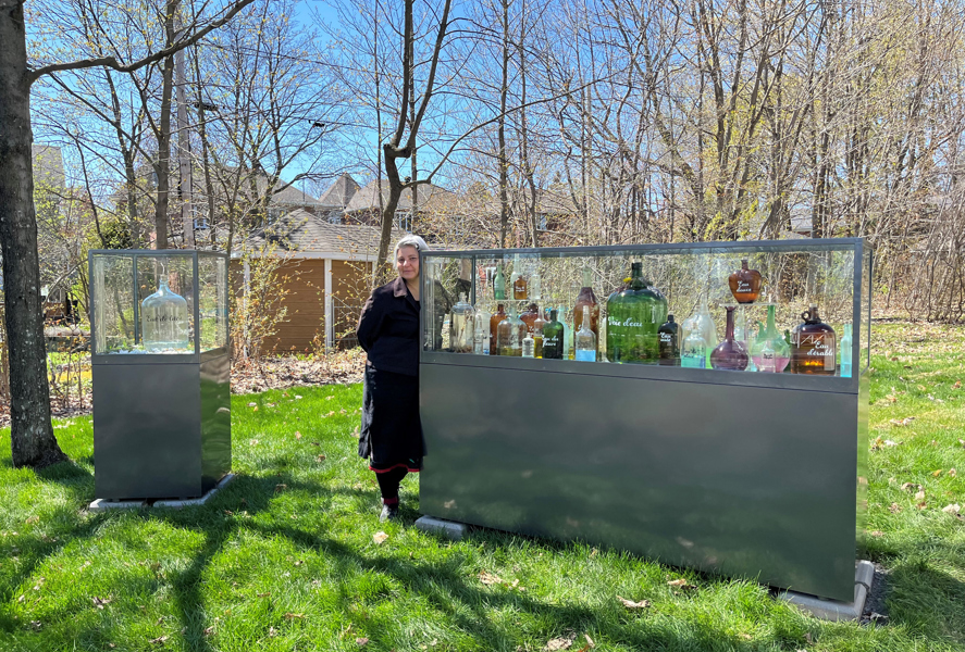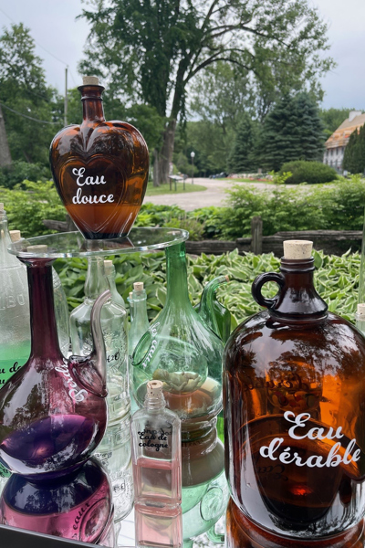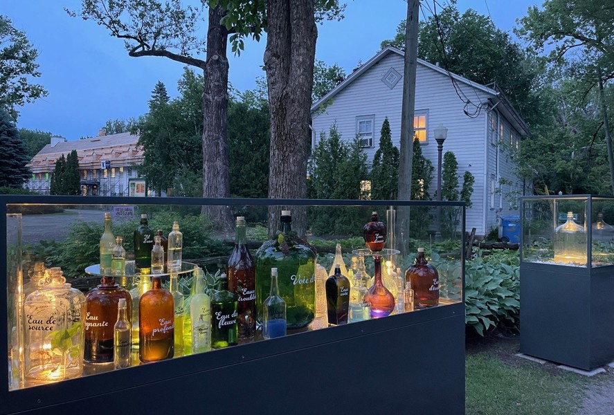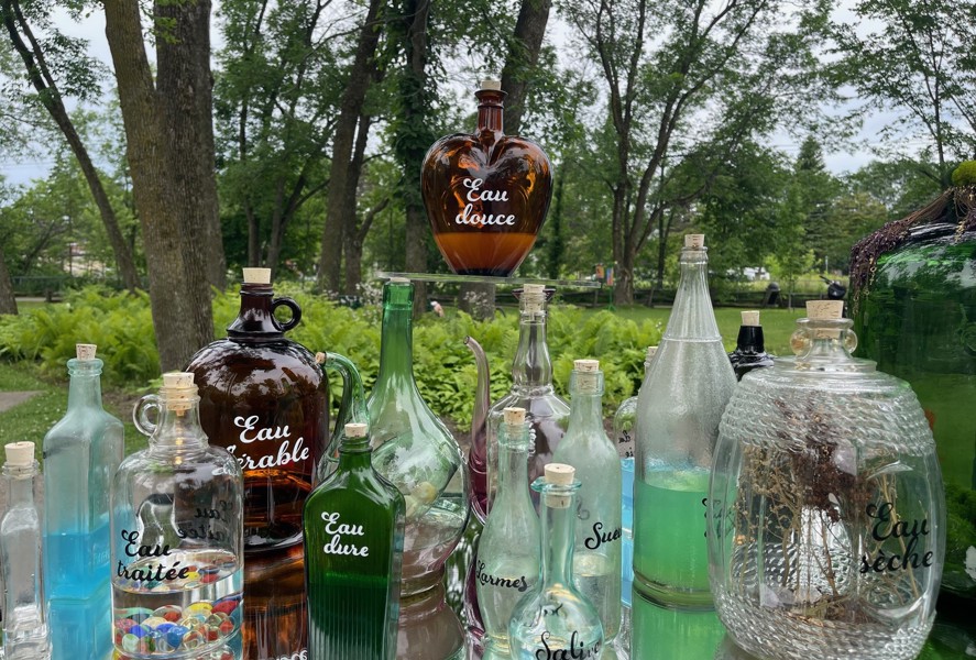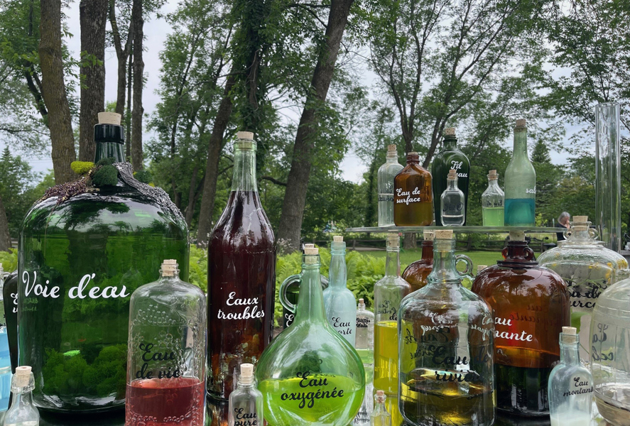 Ces deux vitrines mettent en valeur une collection de bouteilles récupérées en provenance de différentes époques. Chaque contenant est associé à l’eau et contient un objet ou un liquide particulier.