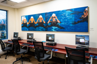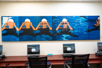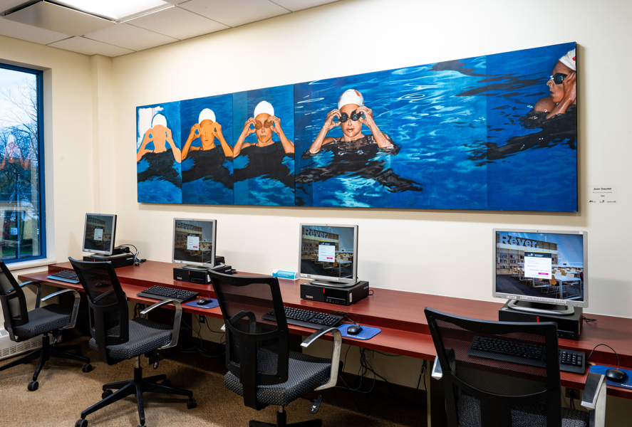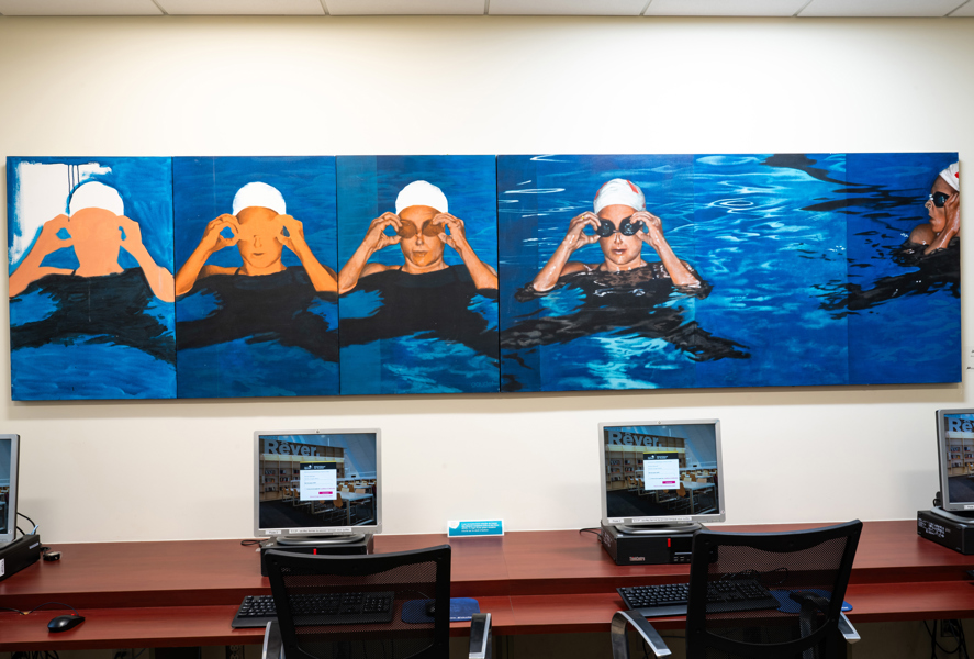 L’œuvre présente une nageuse qui ajuste ses lunettes protectrices pour mieux voir le public qui l’observe, public qui se trouve surpris d’être observé en retour. La peinture offre ainsi un jeu de croisements de regards en mettant face à face des protagonistes qui s’adonnent à une activité de détente (la nage et la lecture).