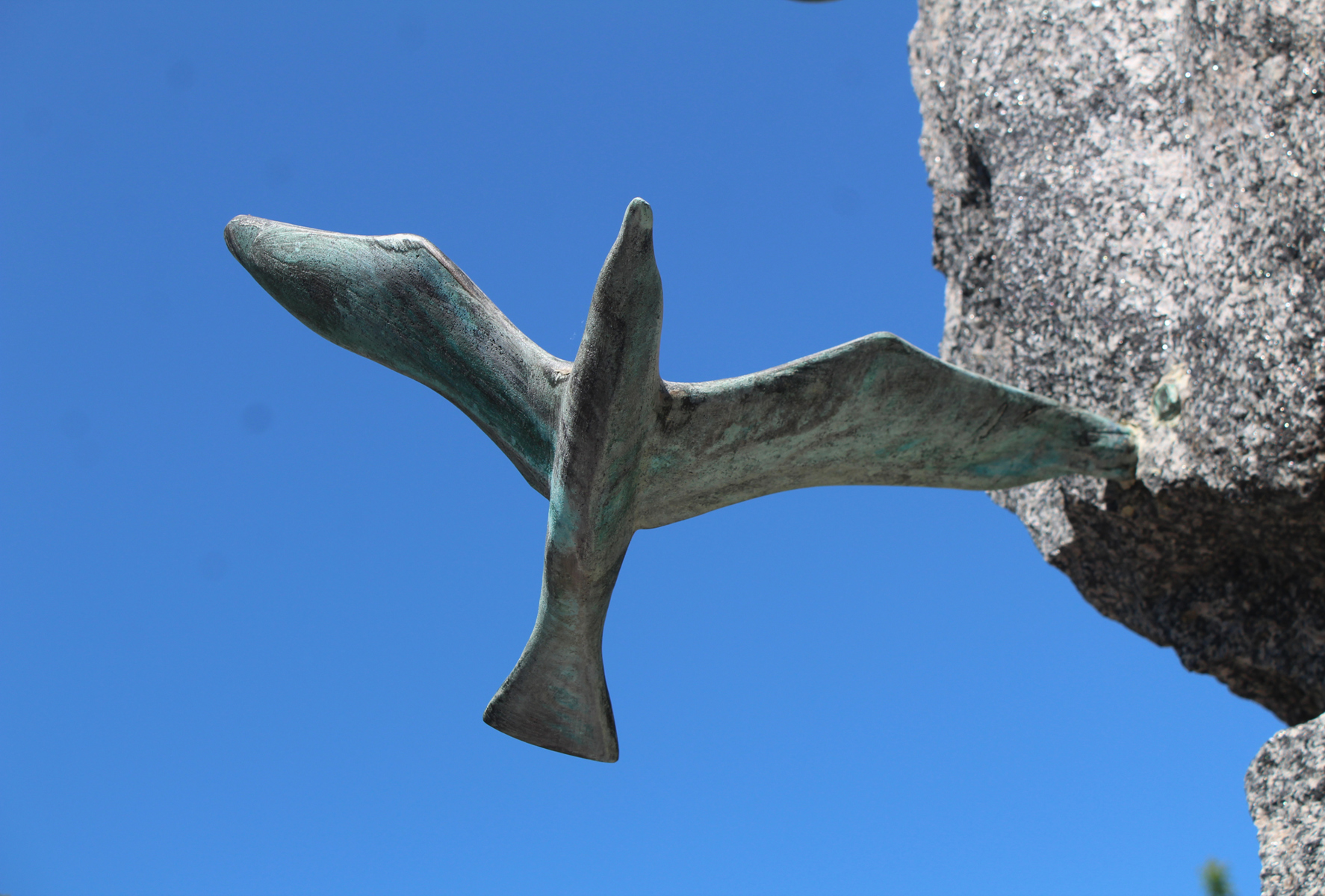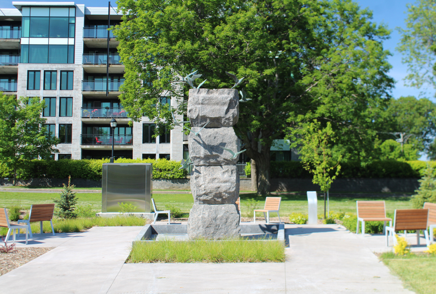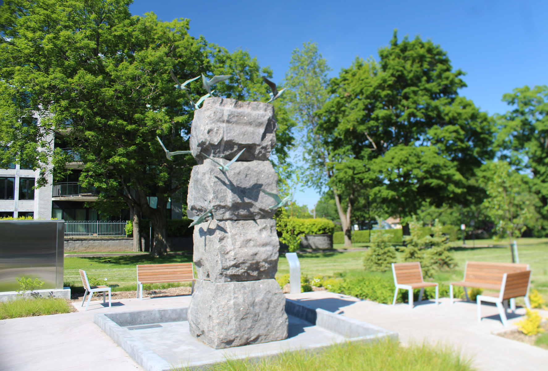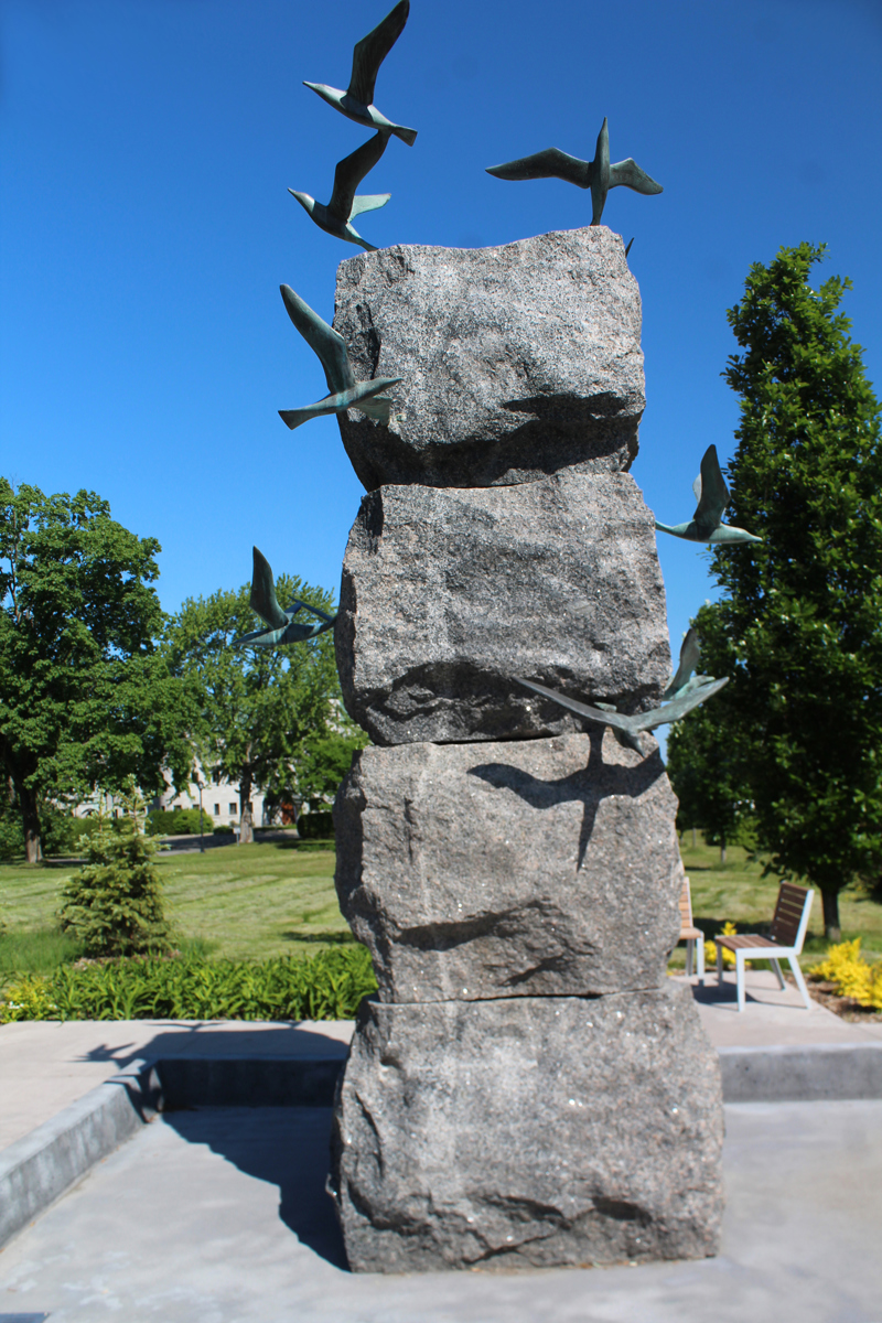 Des oiseaux s’envolent vers le ciel depuis une construction de pierres d’où s’écoule doucement de l’eau en saison estivale. Le caractère massif et brut du granit contraste avec l’aspect léger et délicat des oiseaux. Conçue pour que le ruissellement et le son de l’eau procurent un apaisement, cette sculpture-fontaine se veut une oasis de paix en milieu urbain. Initialement créée pour le parc Lavigerie, l’œuvre a été déplacée en 2024 dans un aménagement adapté.