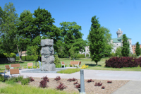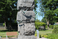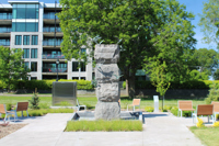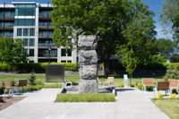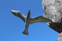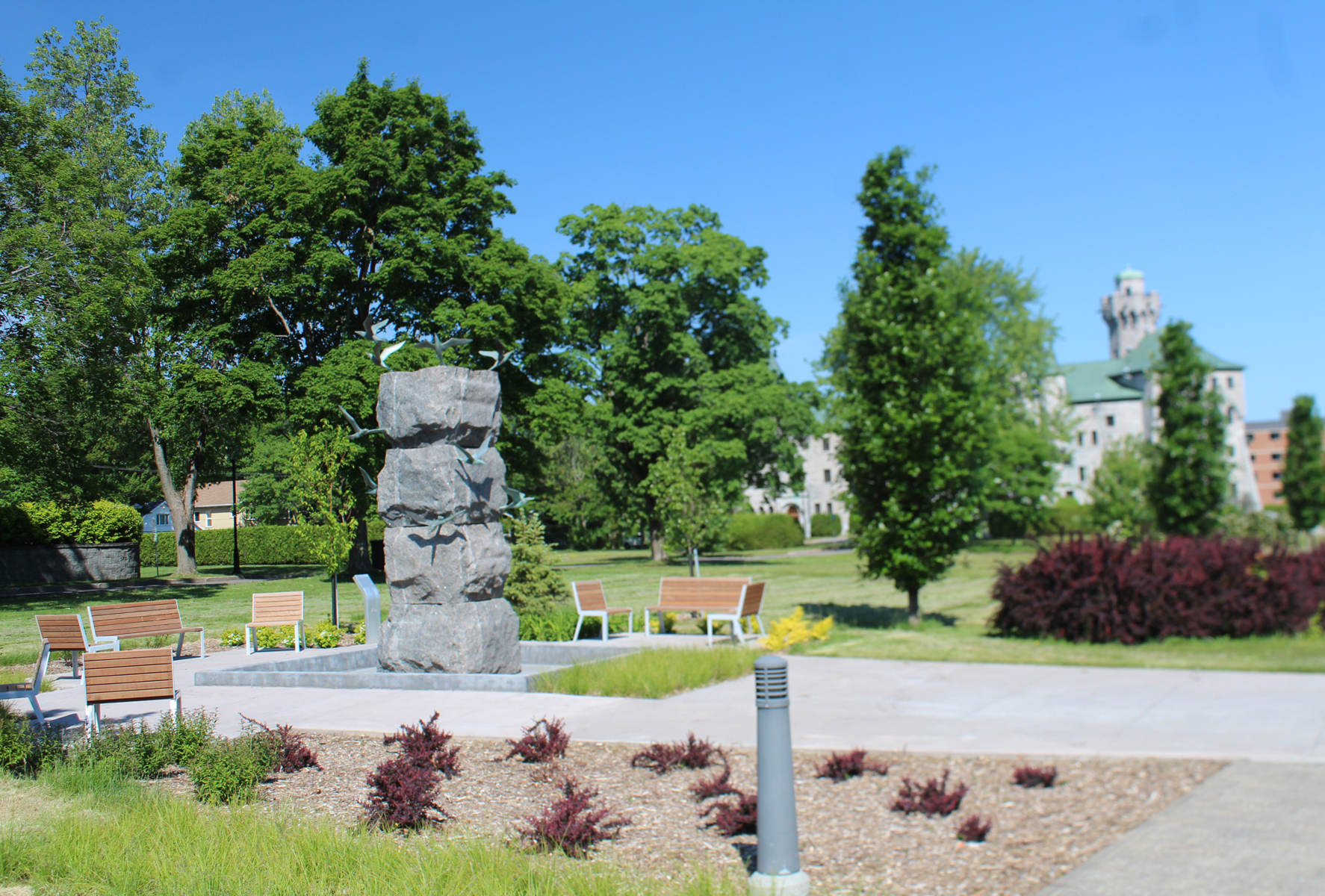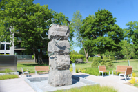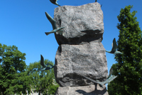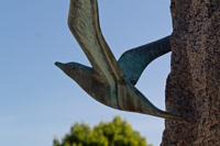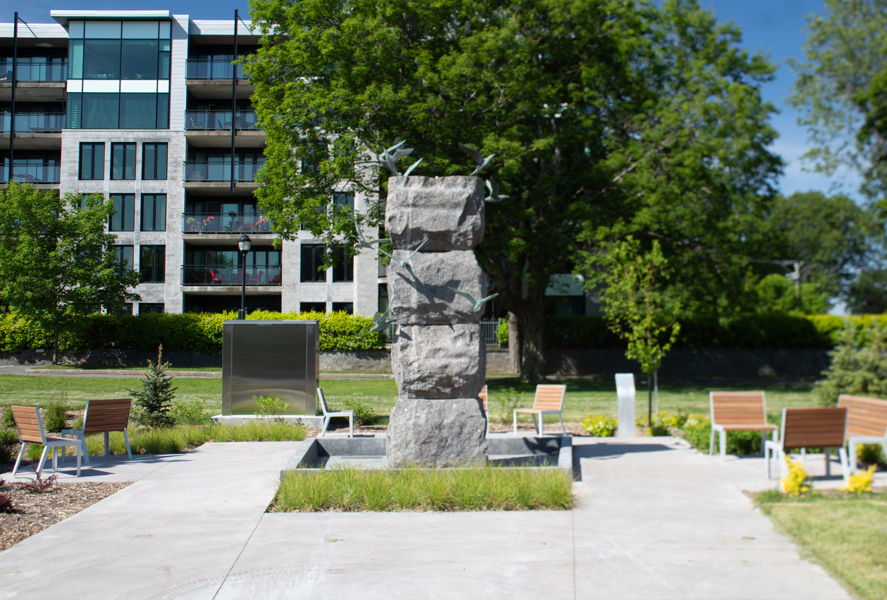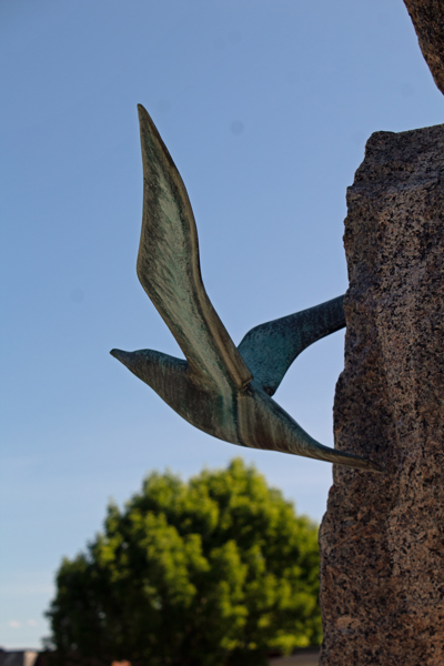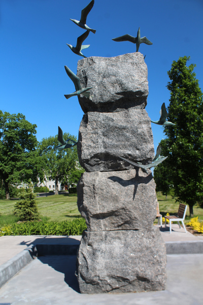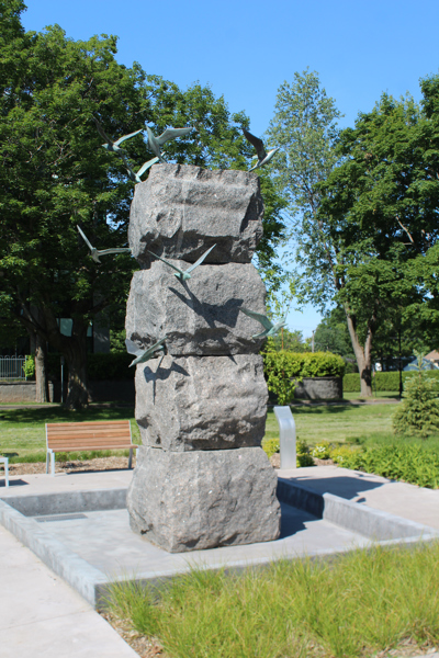 Des oiseaux s’envolent vers le ciel depuis une construction de pierres d’où s’écoule doucement de l’eau en saison estivale. Le caractère massif et brut du granit contraste avec l’aspect léger et délicat des oiseaux. Conçue pour que le ruissellement et le son de l’eau procurent un apaisement, cette sculpture-fontaine se veut une oasis de paix en milieu urbain. Initialement créée pour le parc Lavigerie, l’œuvre a été déplacée en 2024 dans un aménagement adapté.