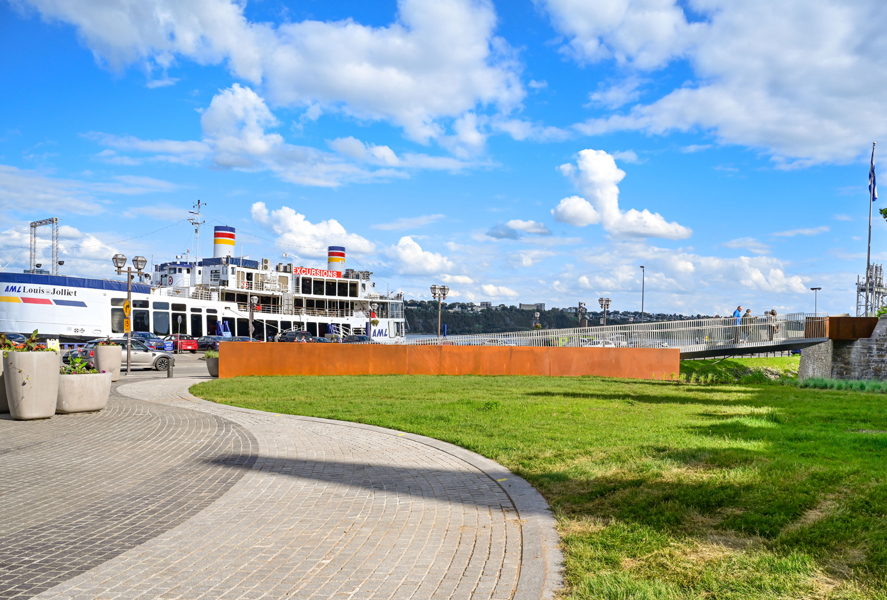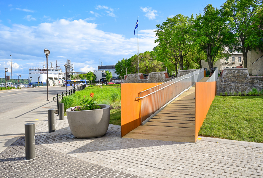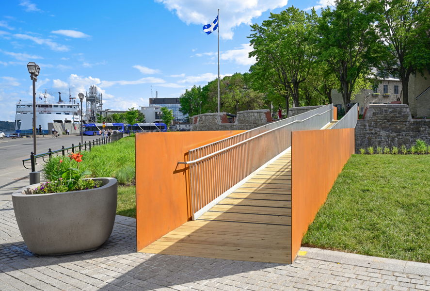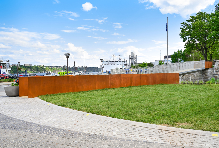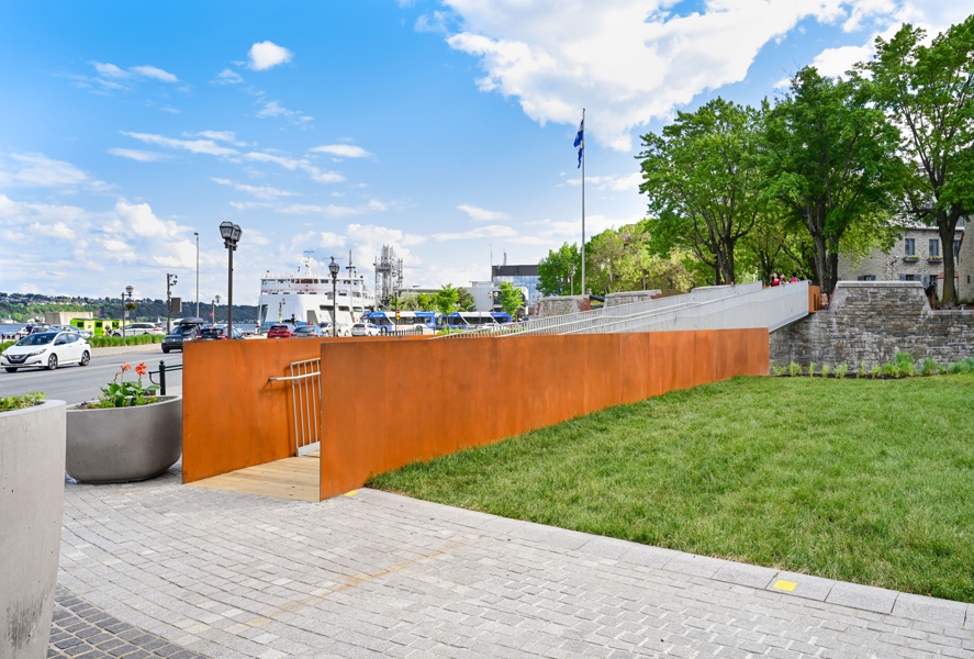 Cette œuvre d’art sculpturale qui relie la place de Paris à la batterie Royale offre une expérience inédite aux passants. Conçue en porte-à-faux, elle s’élance au-dessus de la douve, sans jamais toucher à la section située sur la fortification. Une brèche s’ouvre sur le vide, rappelant la rampe d’un bateau qui s’apprête à accoster.