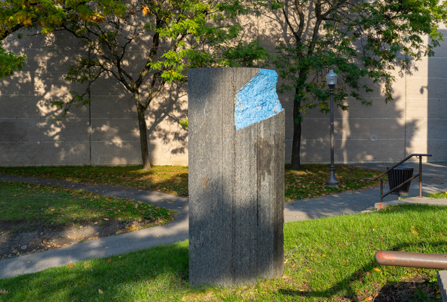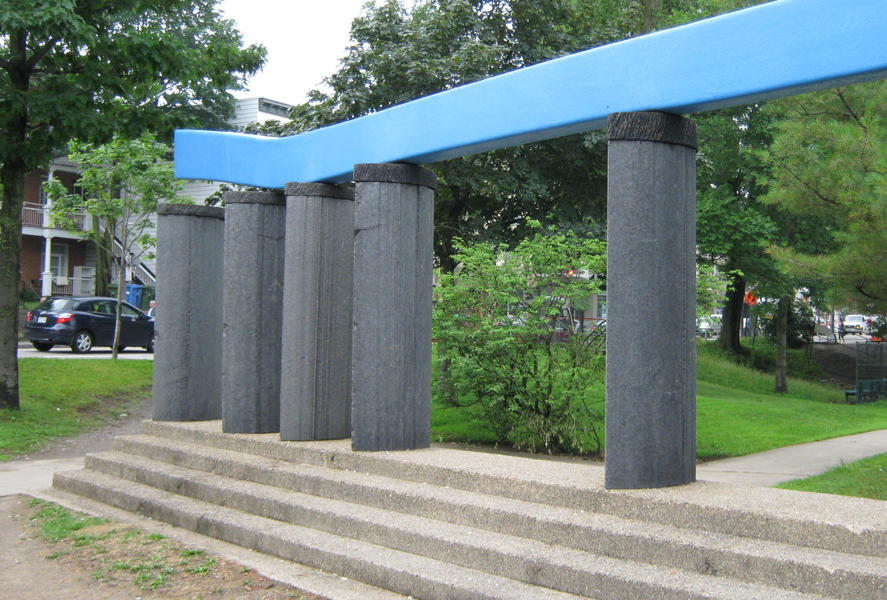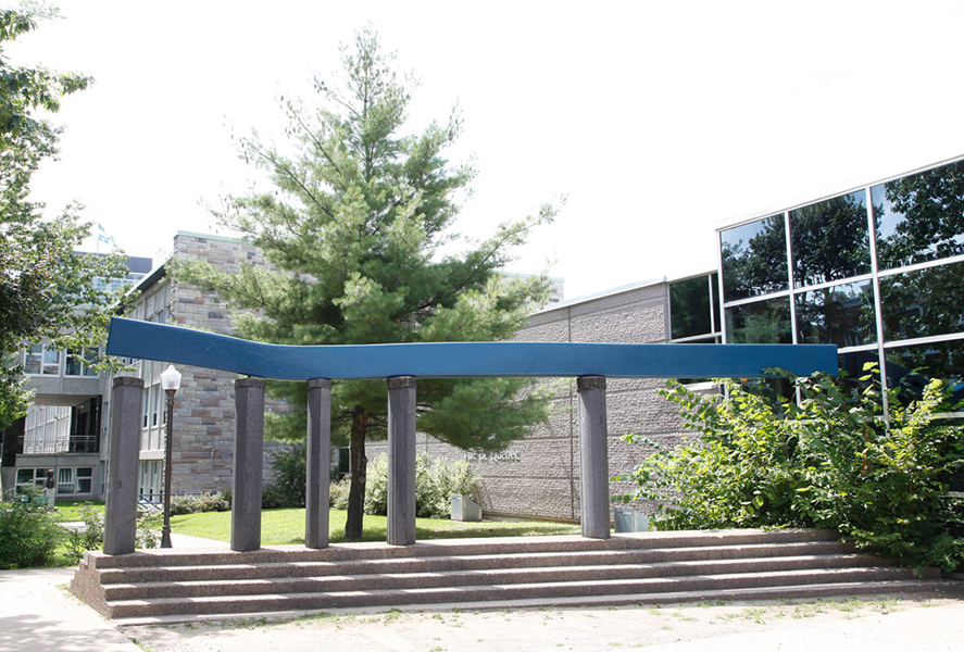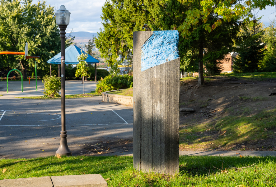 Un dernier élément en bois avec une teinte de bleu, rappelant les unités 1 et 2, termine le parcours à proximité de l’entrée nord, derrière le bâtiment, dans le parc Karim-Ouellet.