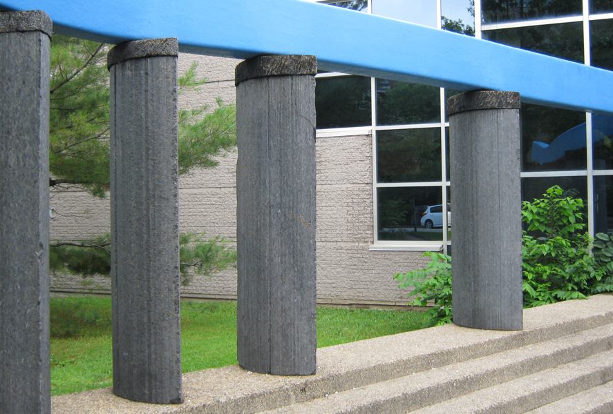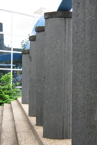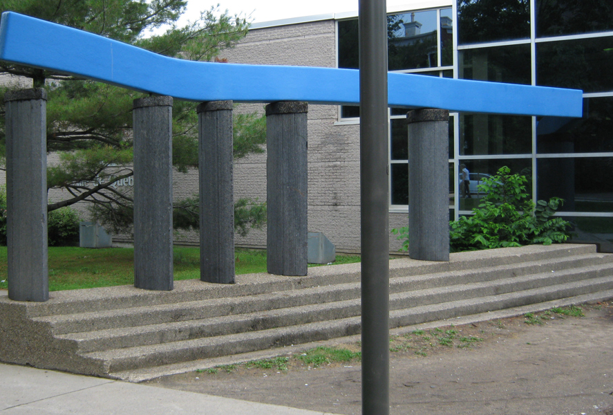 Devant l’entrée principale, une structure filiforme peinte en bleu, reposant sur une colonnade, transcrit formellement l’état de tension d’un muscle en action. Le tout surmonte un podium à double escalier et se prolonge au portique.
