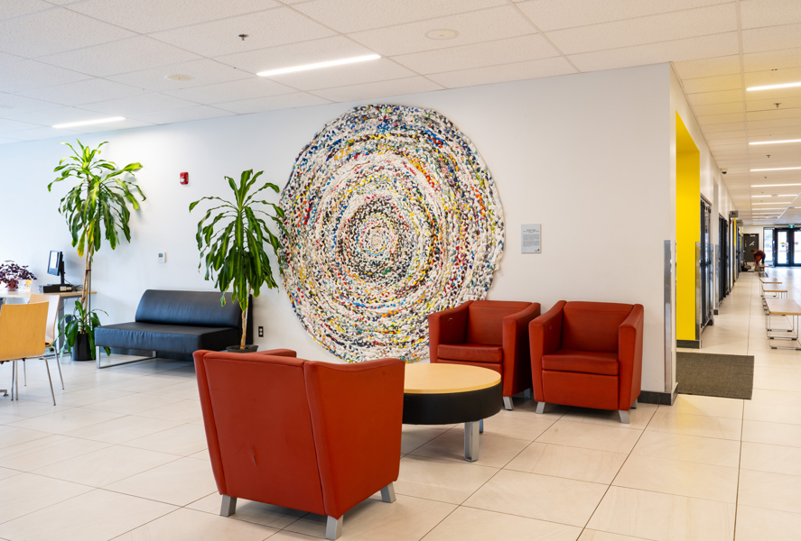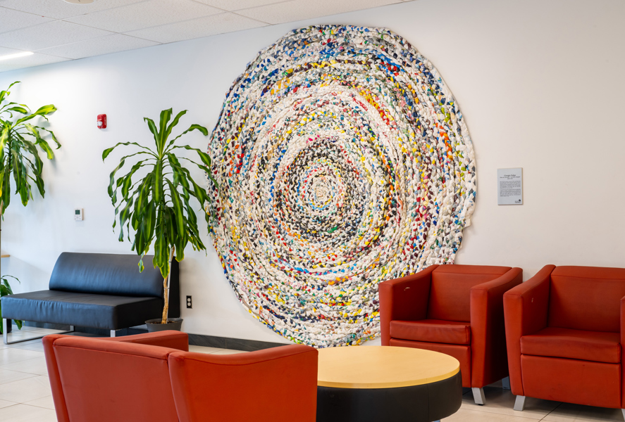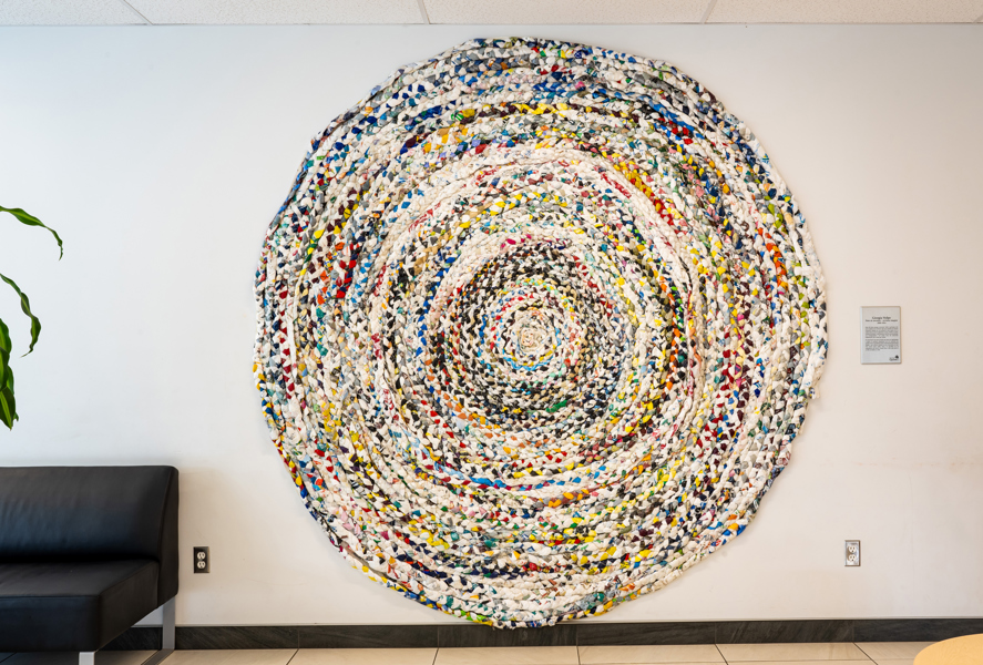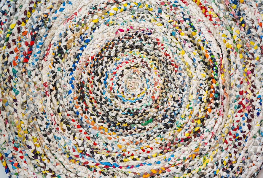 Une longue tresse faite de sacs de plastique est enroulée sur elle-même pour former un immense tapis, semblable à ceux qui ornaient les maisons autrefois. L’artiste a réalisé cette œuvre sur une période de huit ans avec l’aide de dizaines de personnes rencontrées un peu partout au Québec.