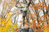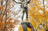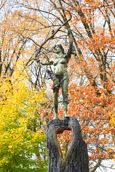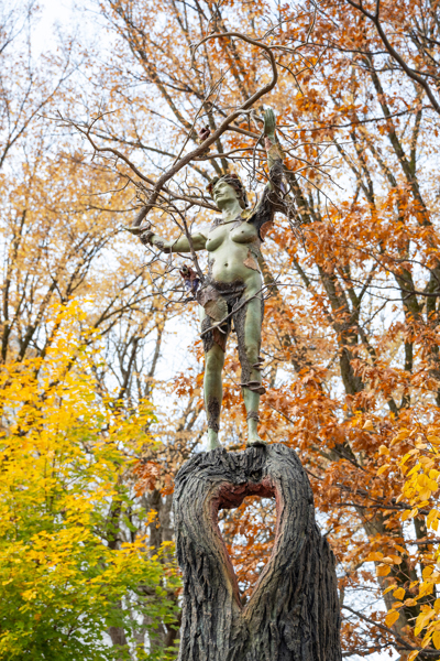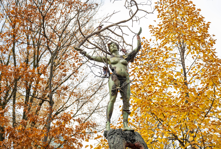 Porter les songes à la limite du ciel prend la forme d'une femme végétale qui émerge d’un tronc d’arbre. L’œuvre intègre des fragments de l'orme, tandis que sa base est fidèlement reproduite en bronze. Un nœud dans l’écorce, rappelant la forme d’un cœur, ainsi que des branches de l'arbre majestueux, enrichissent cette œuvre pleine de vitalité.