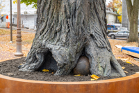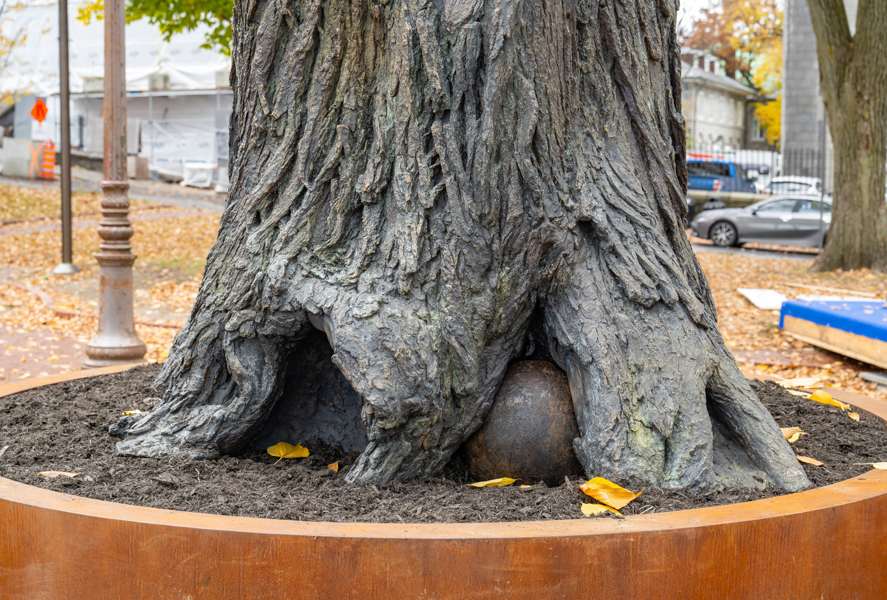 On a longtemps cru que ce projectile était un boulet de canon lancé par les Britanniques en 1759, remonté à la surface avec la croissance de l'arbre. Bien que fausse, l’anecdote a donné son surnom à l’arbre au « boulet ». Affaibli par la maladie, l’orme a dû être abattu en 2021 pour des raisons de sécurité publique. Le fameux projectile a toutefois été conservé et réintégré dans cette œuvre.