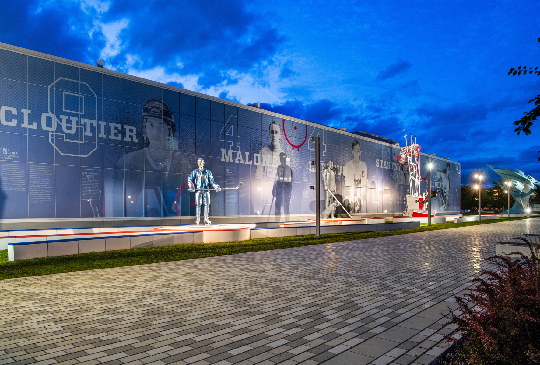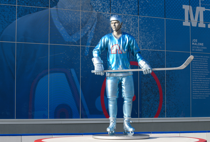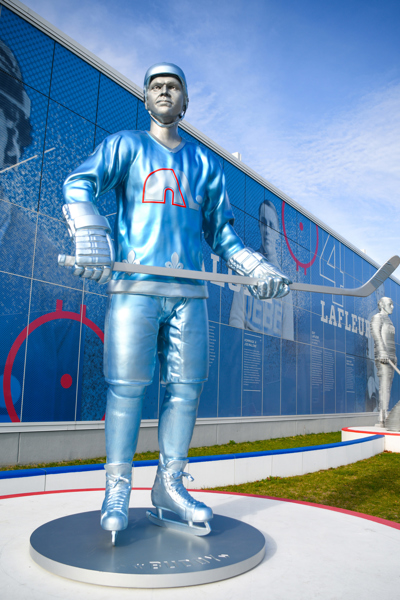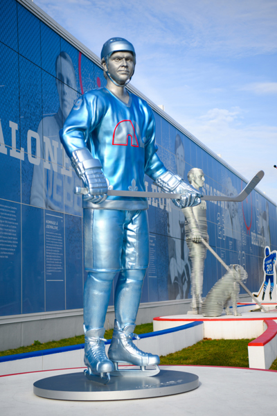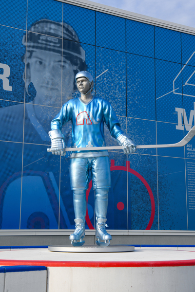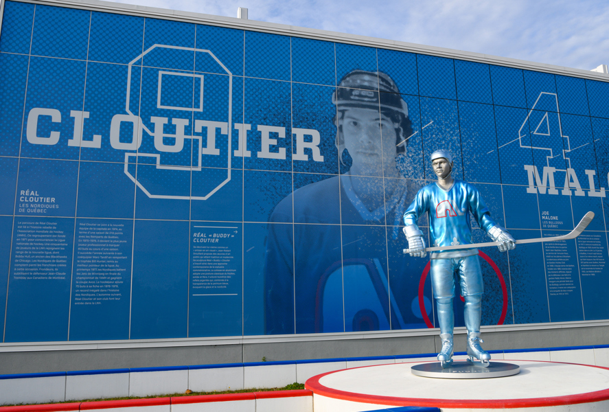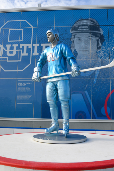 Se décrivant lui-même comme un « artisan en art visuel », Jean-Robert Drouillard propose des œuvres d’art public qui allient tradition et modernité. Sa sculpture Réal « Buddy » Cloutier s’inscrit ainsi dans une approche contemporaine de la statuaire commémorative. Le colosse en aluminium adopte une posture classique du hockey, solide et fière. Il arbore toutefois des reflets argentés qui, combinés à la transparence de la peinture bleue, évoquent la glace et la nordicité.