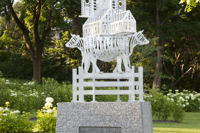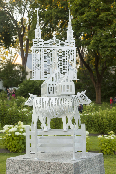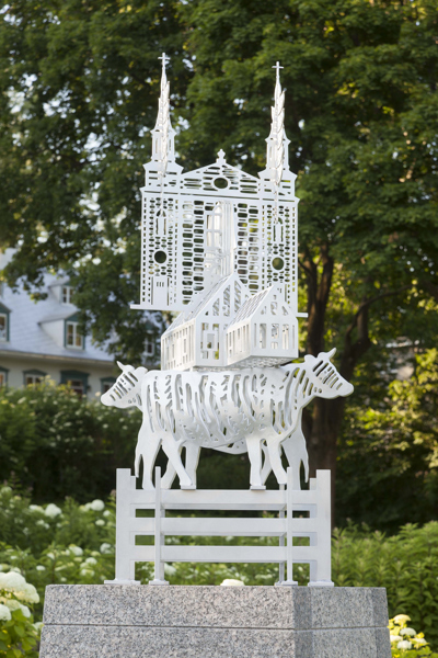 Cette sculpture réunit des éléments particuliers du patrimoine bâti, religieux et humain de Charlesbourg, désigné site patrimonial en 1964. Les éléments figuratifs sont empilés comme un totem créant une figure hybride à la fois symbolique et mythique.