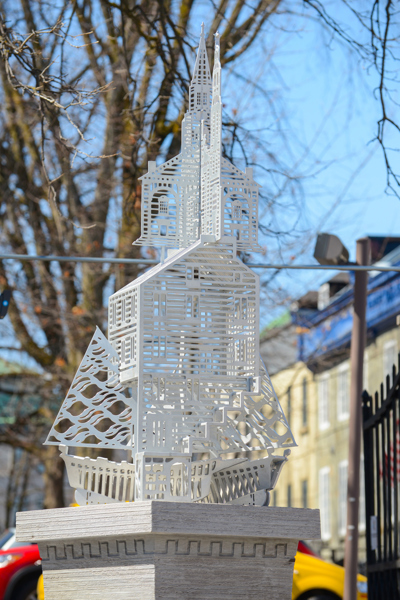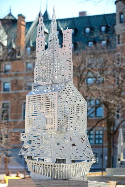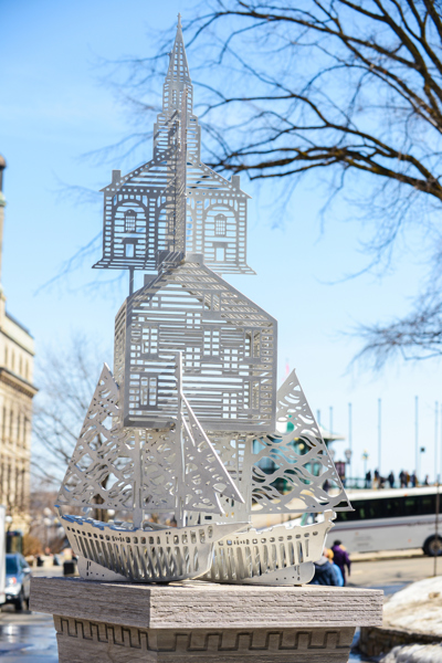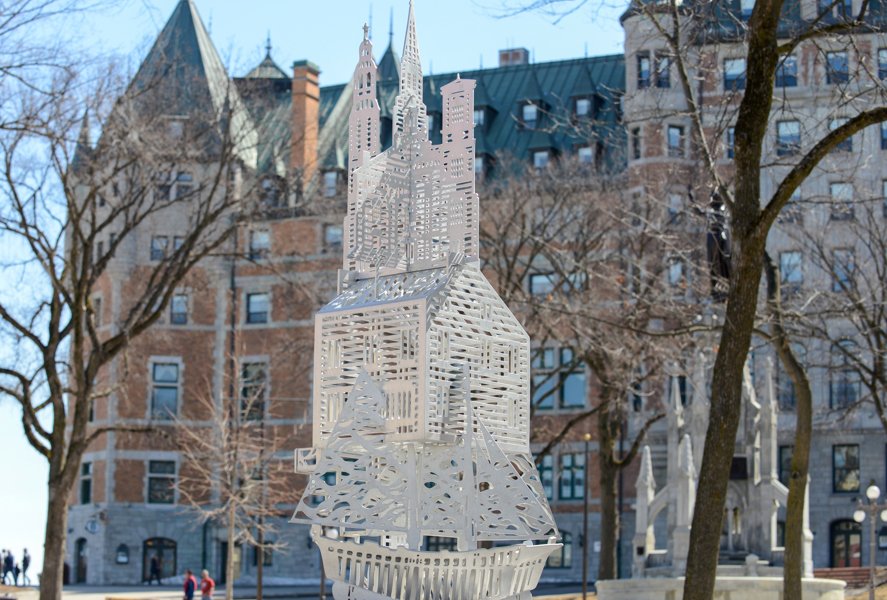 Cette sculpture réunit en une sorte de totem des éléments particuliers du patrimoine bâti, religieux et humain du Vieux-Québec, désigné site patrimonial en 1963. Les éléments figuratifs sont empilés comme un totem créant une figure hybride à la fois symbolique et mythique.