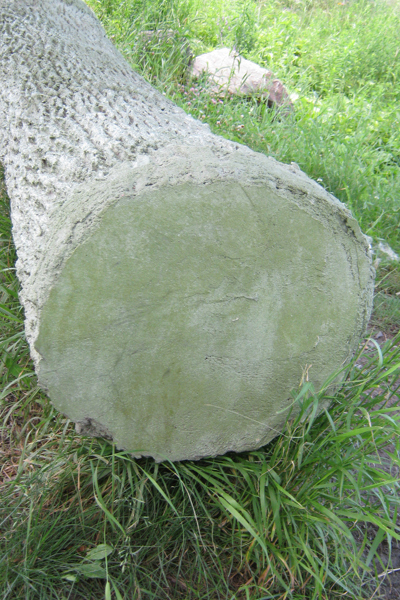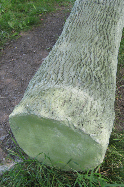 Cette sculpture-banc en béton côtoie un frêne dont elle reproduit le tronc à un moment de sa croissance. Elle le fige dans le temps tandis que le modèle vivant, tout près, continue de se développer au gré des saisons. Le marcheur se trouve ainsi en présence de différentes temporalités : la rivière qui suit son cours, le frêne qui croît d’année en année, la pause bienvenue au milieu de la promenade.