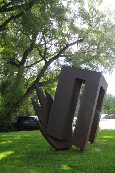 Deux modules en équilibre instable figurent les tensions qui opposent l’être humain et la nature. Évocation de la vie et de la spiritualité, la flamme jaillit du sol pour soulever une table triangulaire qui, elle, renvoie à la raison et à l’architecture.