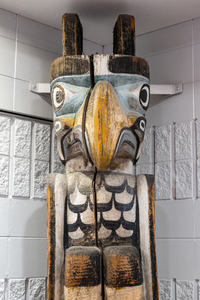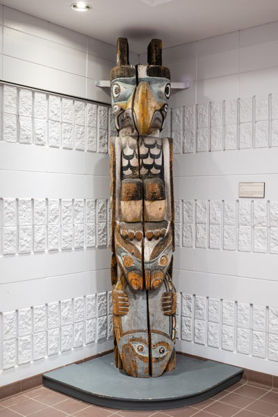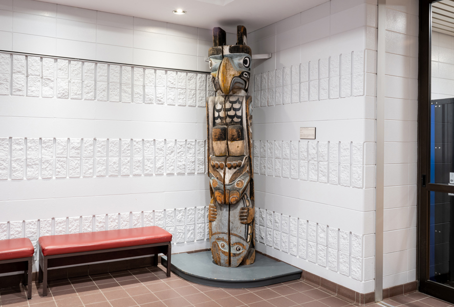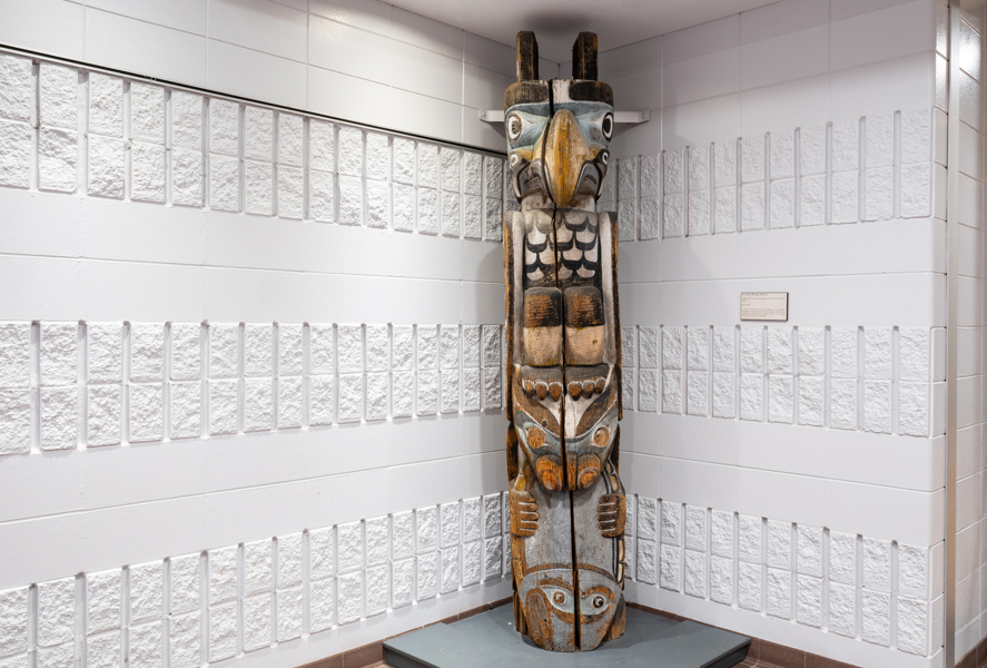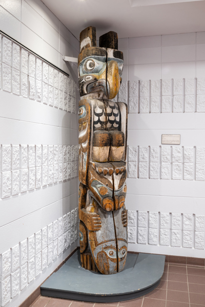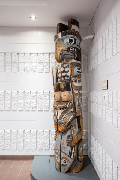 D'abord installé au parc de l'Esplanade, le totem a été relocalisé à l'intérieur du Centre communautaire Michel-Labadie pour des raisons de conservation.