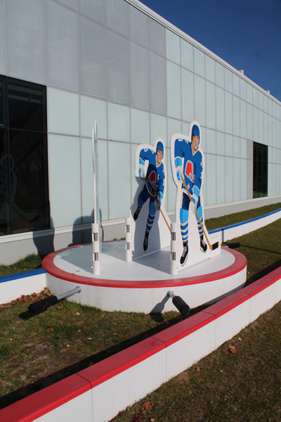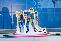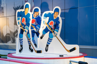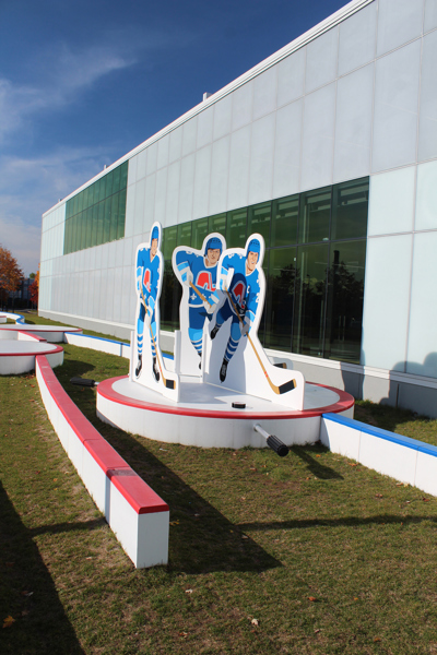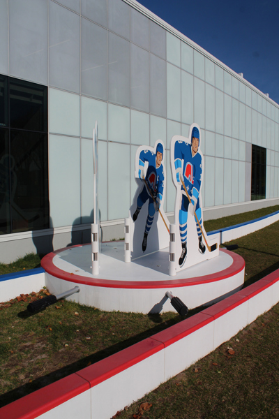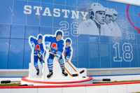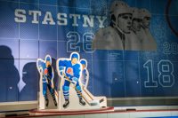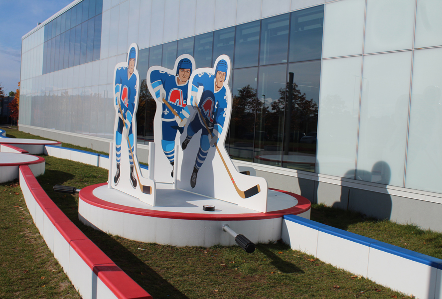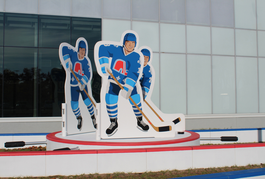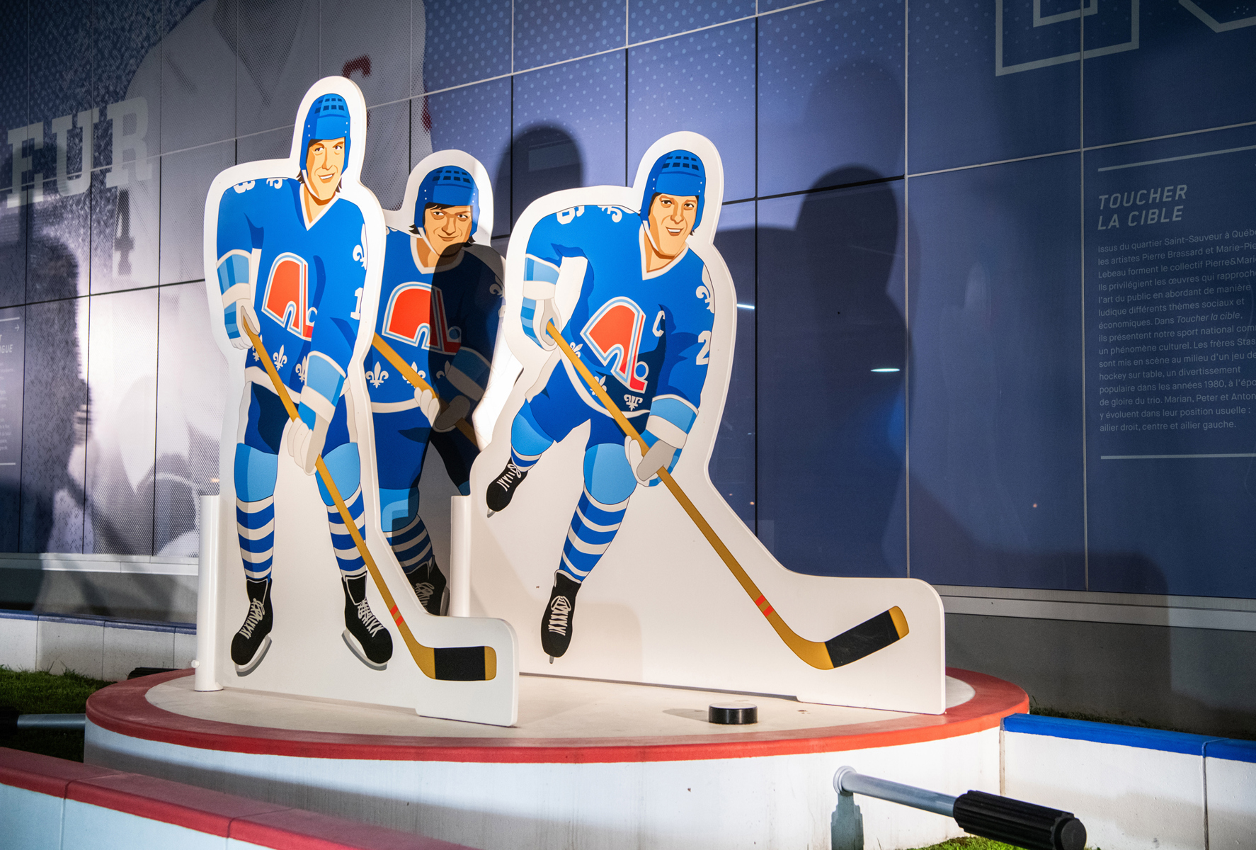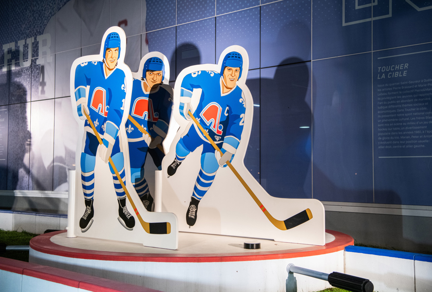 Issus du quartier Saint-Sauveur à Québec, les artistes Pierre Brassard et Marie-Pier Lebeau forment le collectif Pierre&Marie. Ils privilégient les œuvres qui rapprochent l’art du public en abordant de manière ludique différents thèmes sociaux et économiques. Dans Toucher la cible, ils présentent notre sport national comme un phénomène culturel. Les frères Stastny sont mis en scène au milieu d’un jeu de hockey sur table, un divertissement populaire dans les années 1980, à l’époque de gloire du trio. Marian, Peter et Anton y évoluent dans leur position usuelle : ailier droit, centre et ailier gauche.