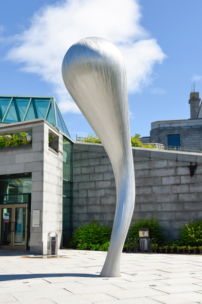 Trombe a l’aspect d’une goutte inversée animée d’un mouvement tourbillonnant. Par son apparente instabilité, elle éveille un sentiment d’étrangeté, voire de danger imminent. Elle dégage en même temps, à la manière d’un menhir, une énergie qui semble provenir des profondeurs de la Terre.