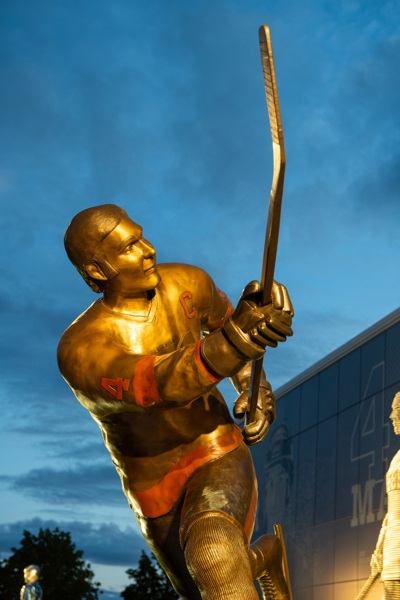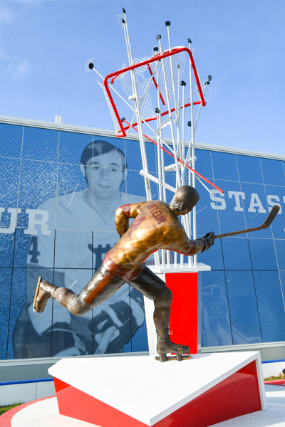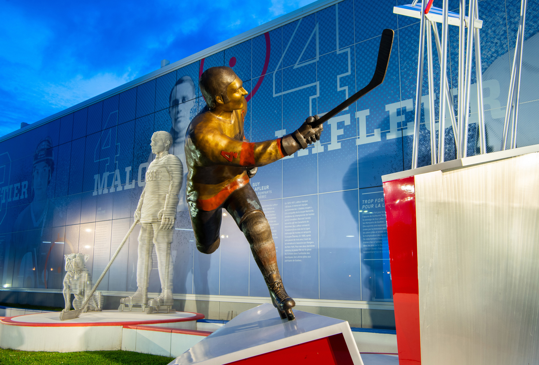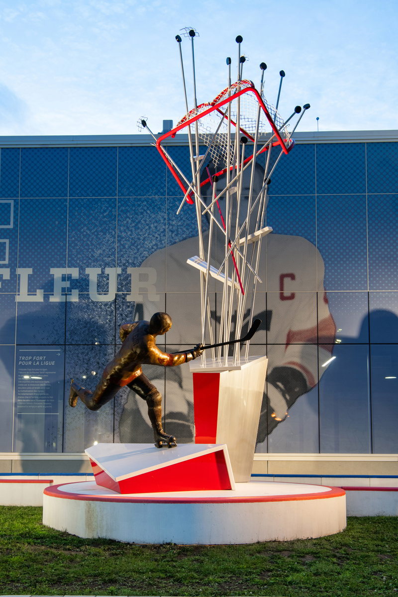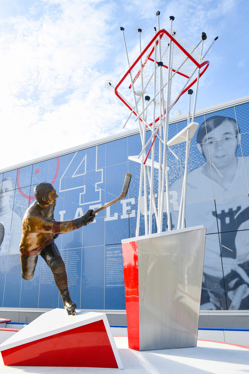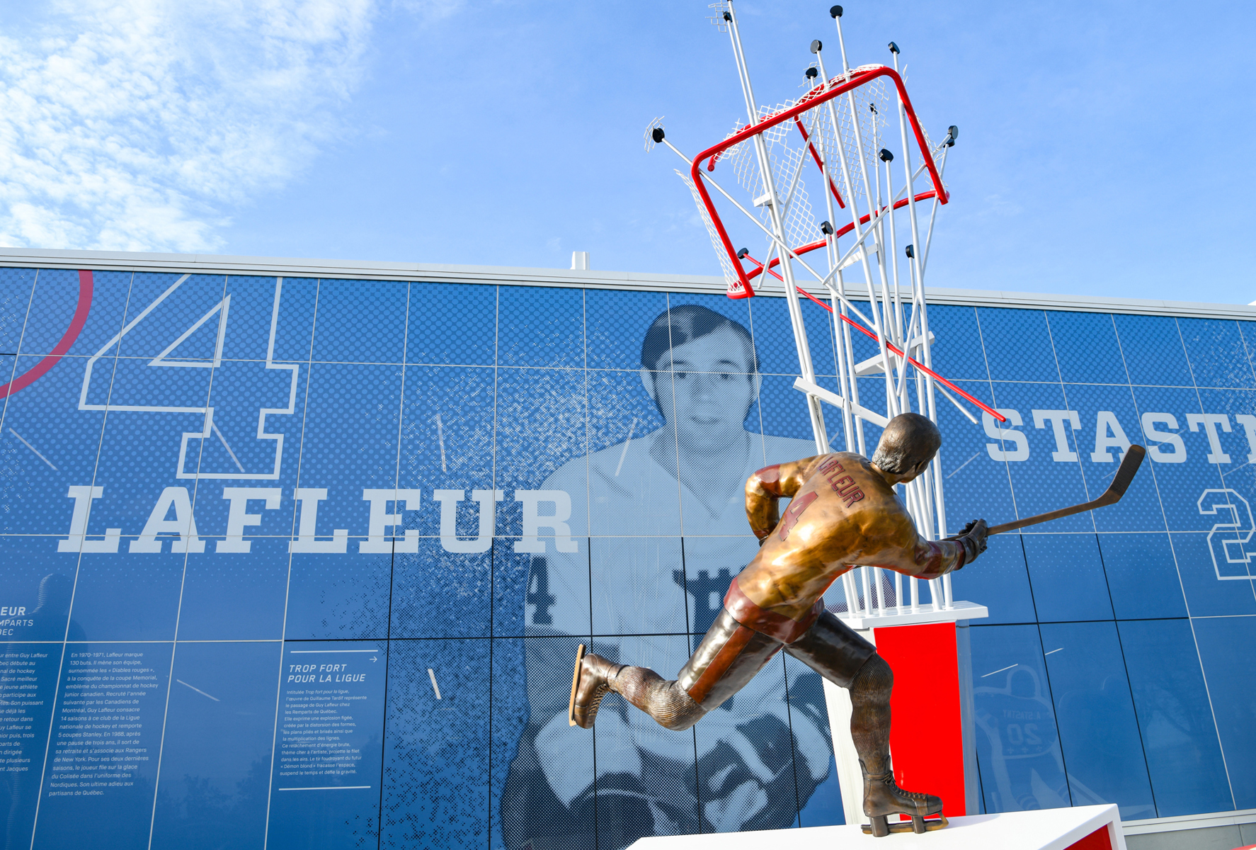 Intitulée Trop fort pour la ligue, l’œuvre de Guillaume Tardif représente le passage de Guy Lafleur chez les Remparts de Québec. Elle exprime une explosion figée, créée par la distorsion des formes, les plans pliés et brisés ainsi que la multiplication des lignes. Ce relâchement d’énergie brute, thème cher à l’artiste, projette le filet dans les airs. Le tir foudroyant du futur « Démon blond » fracasse l’espace, suspend le temps et défie la gravité.