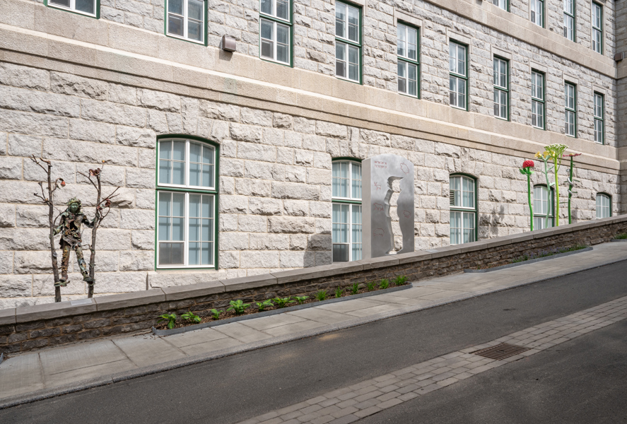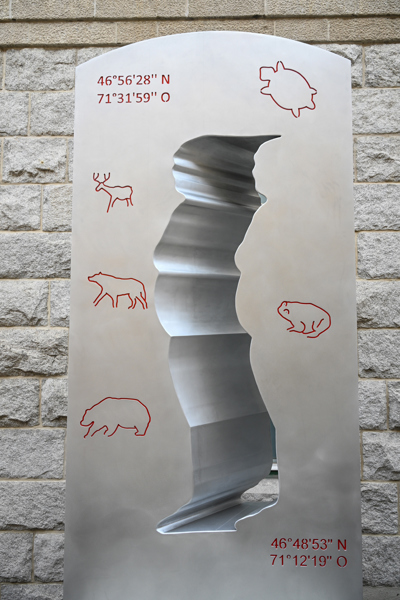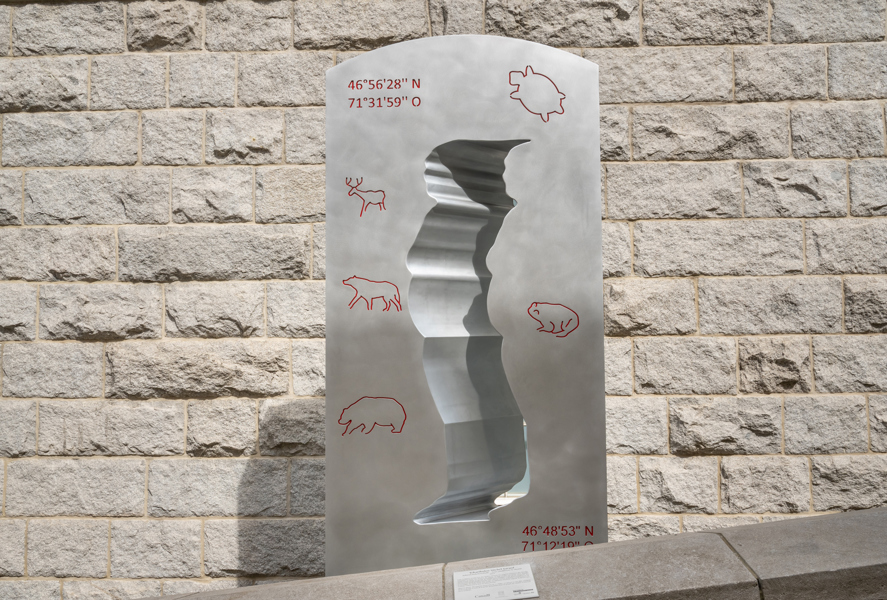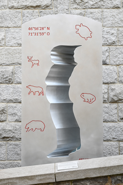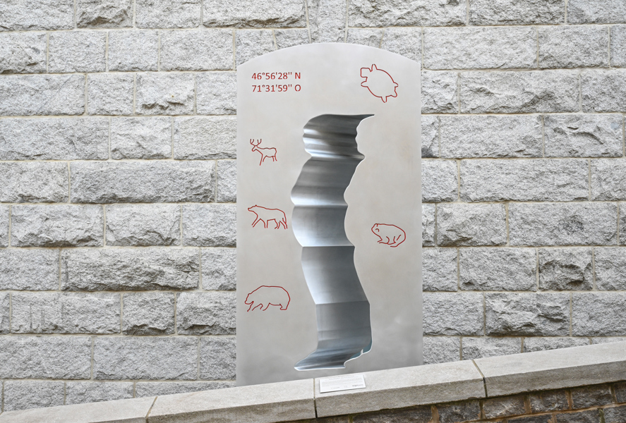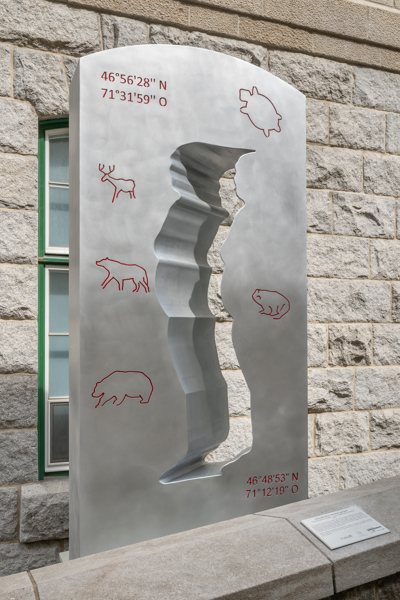 Cette sculpture revisite un mythe retraçant les origines lointaines des Wendats. Rappelant la forme des fenêtres du collège, la stèle évoque une grotte dans laquelle se serait réfugié un groupe de Wendats pour échapper à une guerre sanglante. La grotte, située aux coordonnées géographiques gravées aux coins de l’œuvre, logerait au creux d’une montagne près de Québec. La silhouette féminine regarde d’ailleurs vers ce mont, connu sous le nom de Tsonontouan.