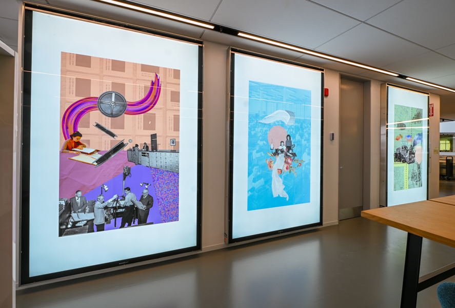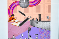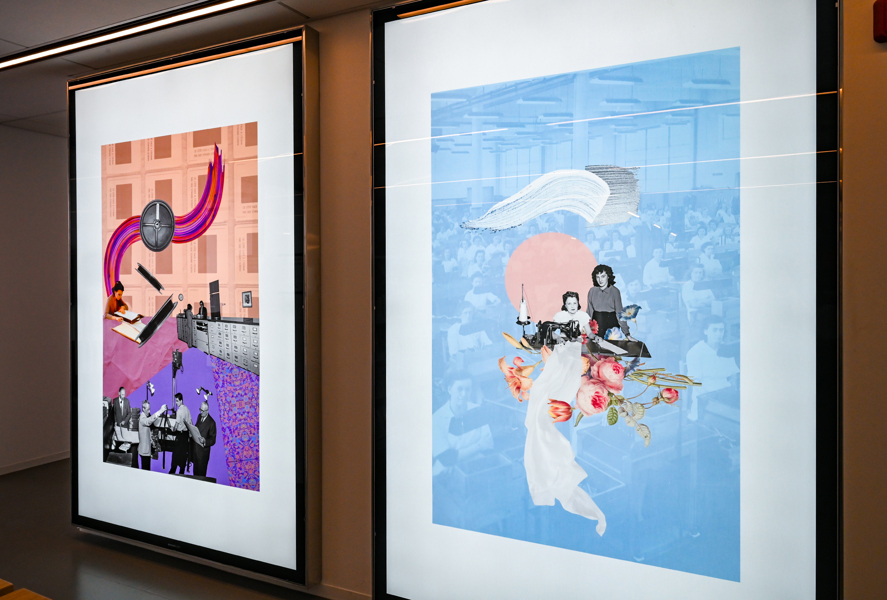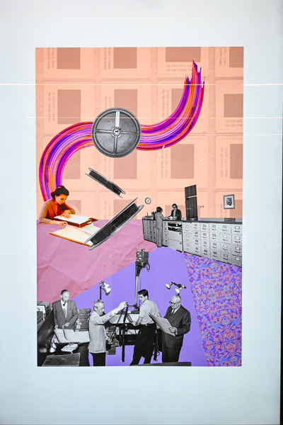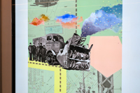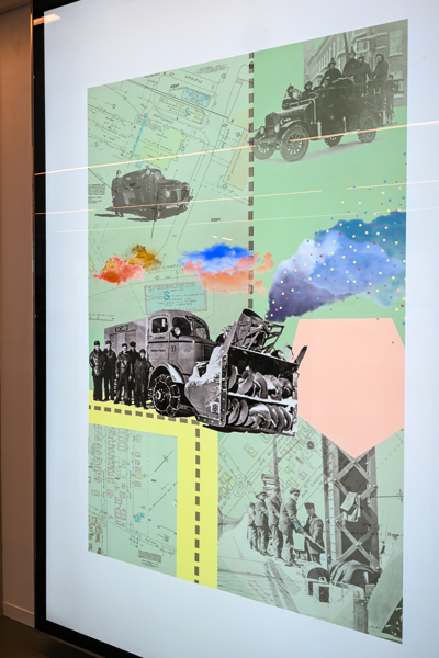 L’artiste crée des collages imprégnés de ces précieux instants d’un siècle de services municipaux. En combinant des photos d'archives de la Ville et des éléments graphiques divers, elle invente des endroits surréalistes où l’on retrouve des bribes d’histoires réinterprétées. Tant de souvenirs qui illuminent et tissent la foisonnante vie de Québec.