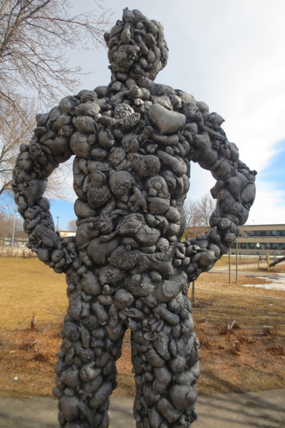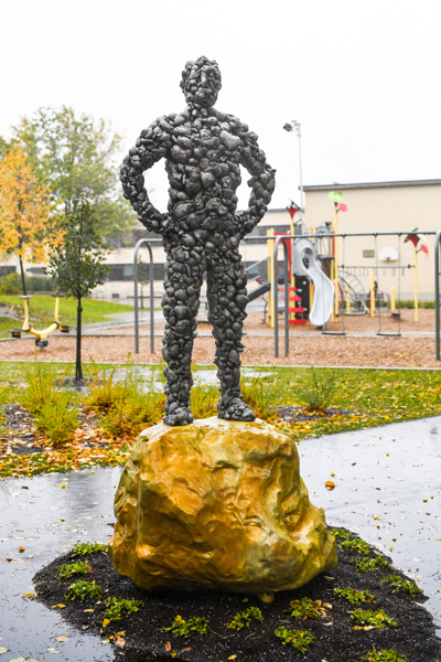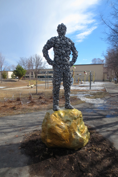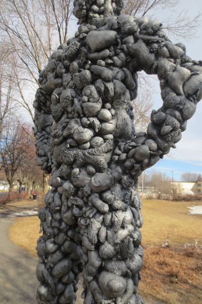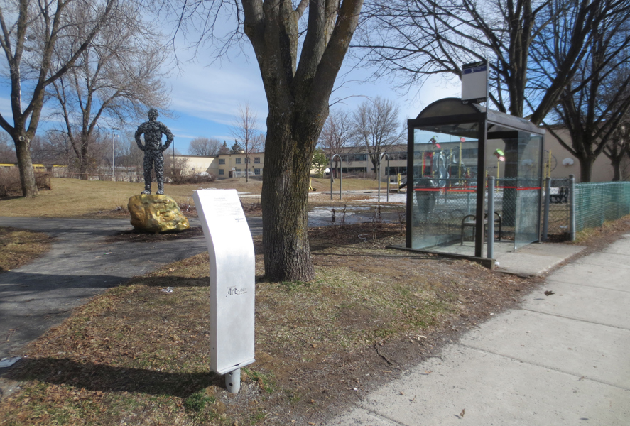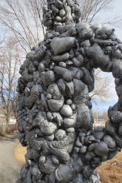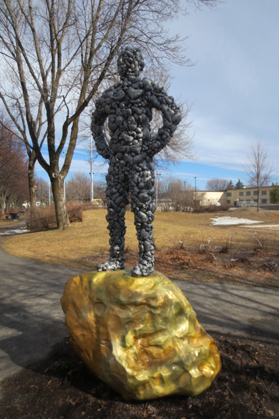 Une touche de merveilleux émane de cette sculpture composée d’une accumulation de peluches. Toute la beauté et la complexité de l’être humain s’incarnent dans ce personnage aux multiples facettes, devenu le fier gardien du parc. Les artistes ont imaginé la forme de l’œuvre après avoir travaillé en atelier avec 12 membres du Mouvement personne d’abord du Québec métropolitain. La pépite d’or sur laquelle repose la sculpture symbolise le précieux apport de cet organisme voué à la défense des droits des personnes vivant avec une déficience intellectuelle.