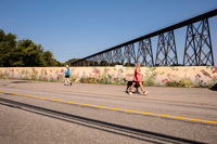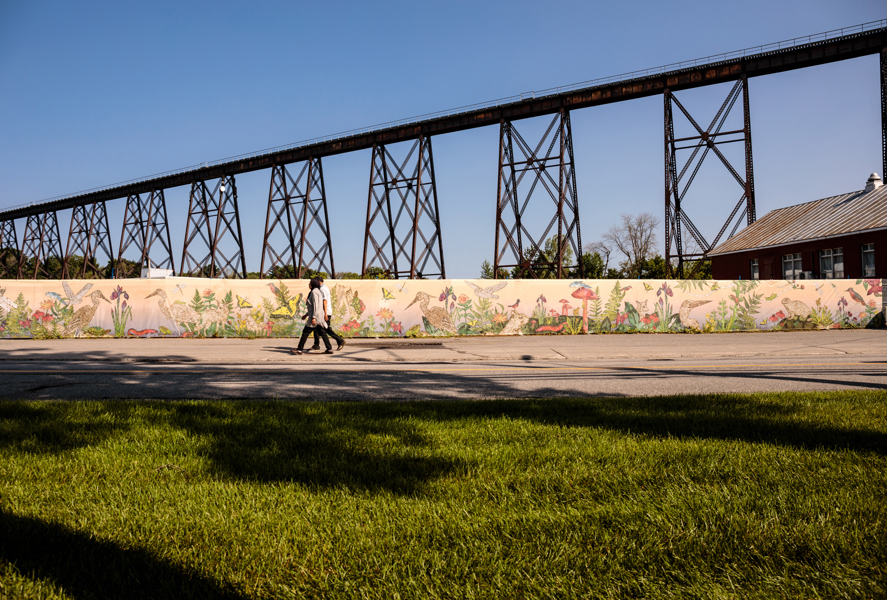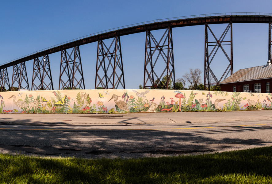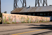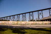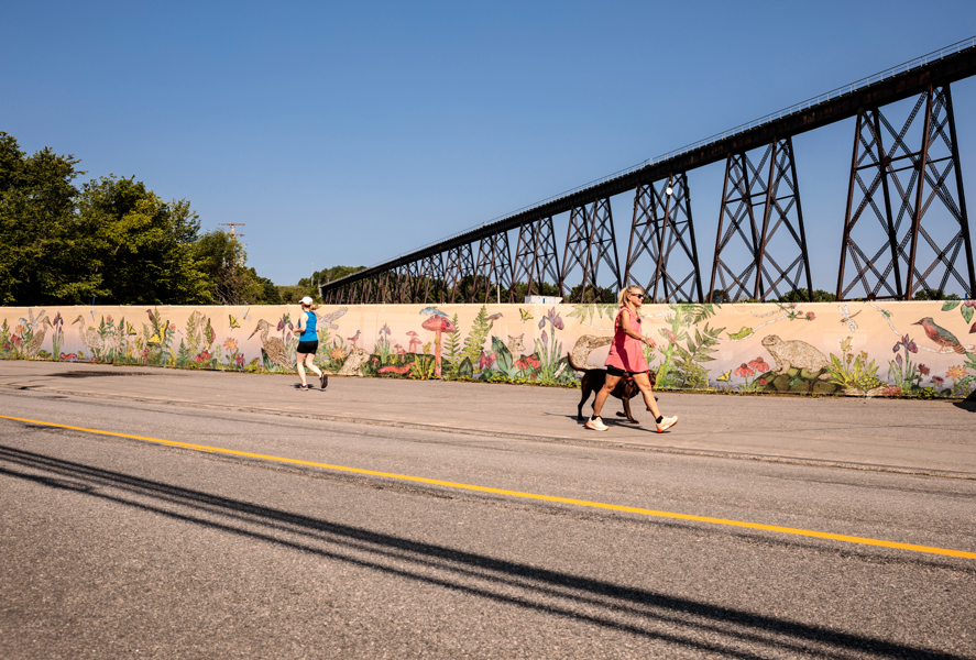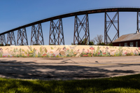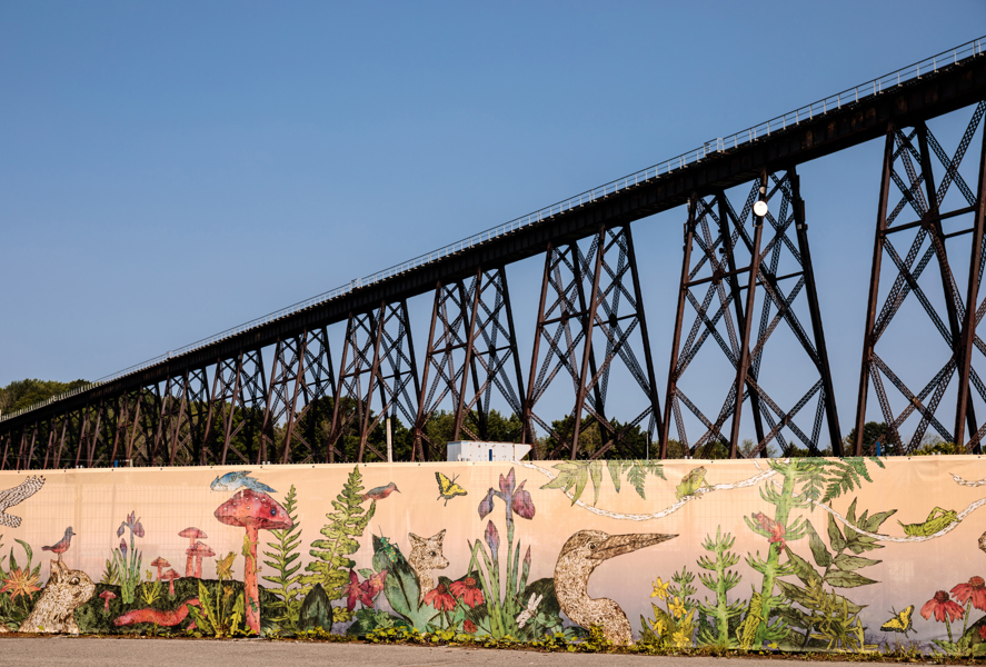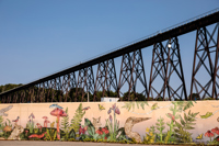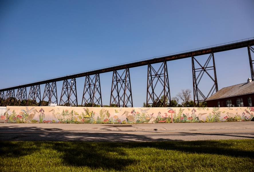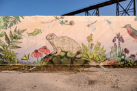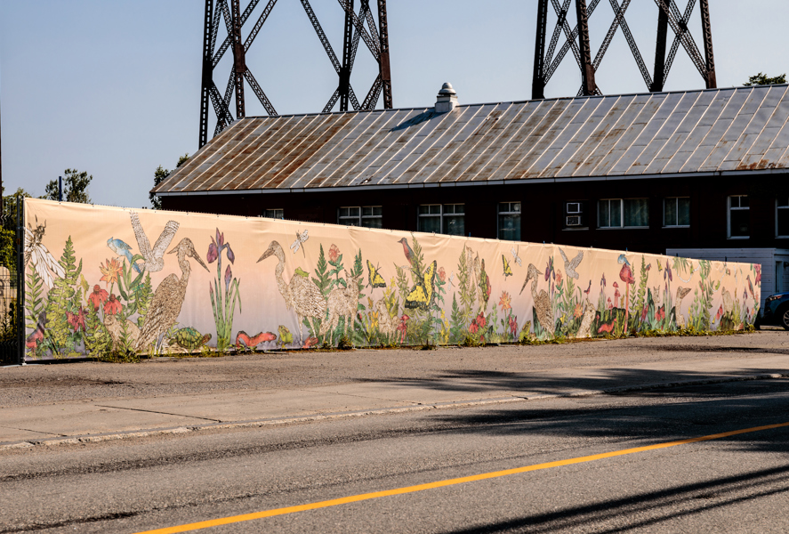 Longeant le site de l’ancienne usine Anacolor, la murale illustre la richesse naturelle qui émane tant des rives du fleuve Saint-Laurent que du sentier de la rivière du Cap-Rouge.