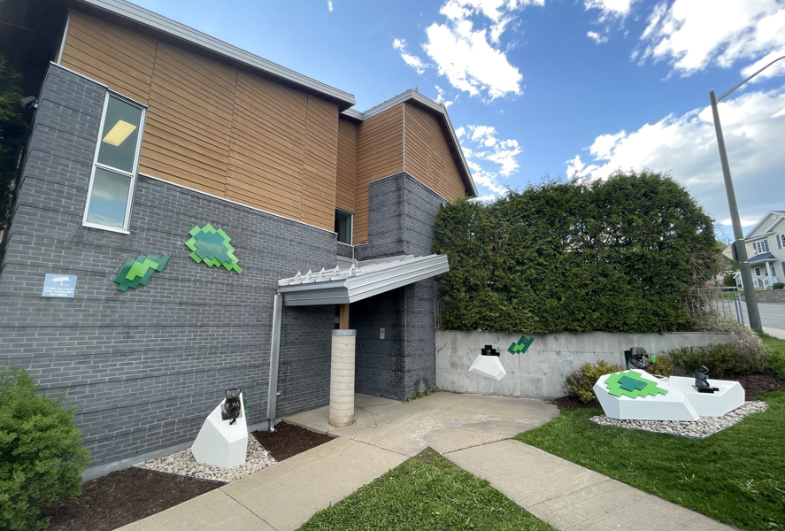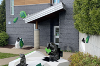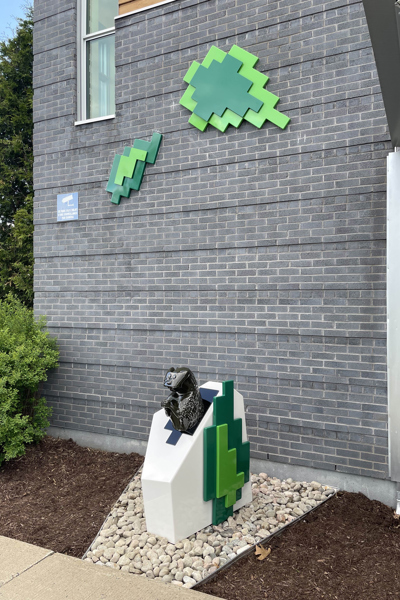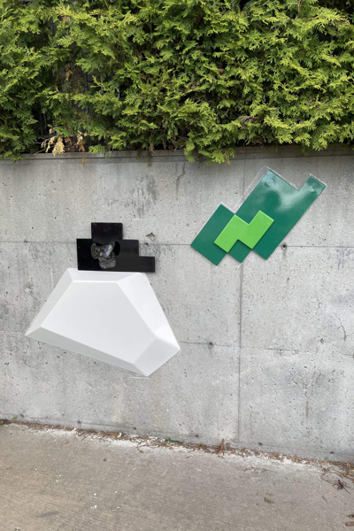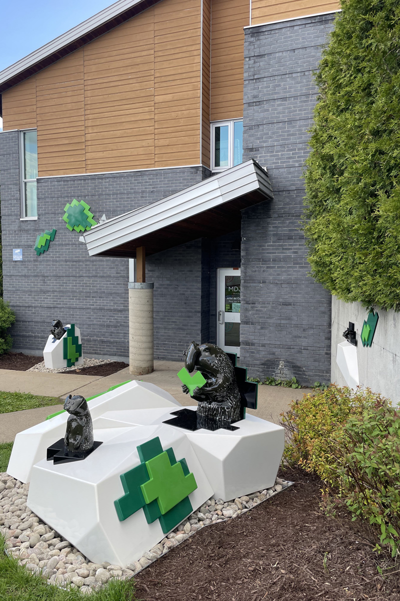 Guillaume Tardif a créé ces sculptures à la suite d’activités de médiation culturelle à la Maison des jeunes L’Alibi. Tout comme les participants qui ont contribué à la conceptualisation de cette oeuvre, les créatures en pleine métamorphose sont imprégnées des technologies numériques. Ce sont des esprits bienveillants, des éclaireurs traversant des portails pixélisés pour venir à notre rencontre.
